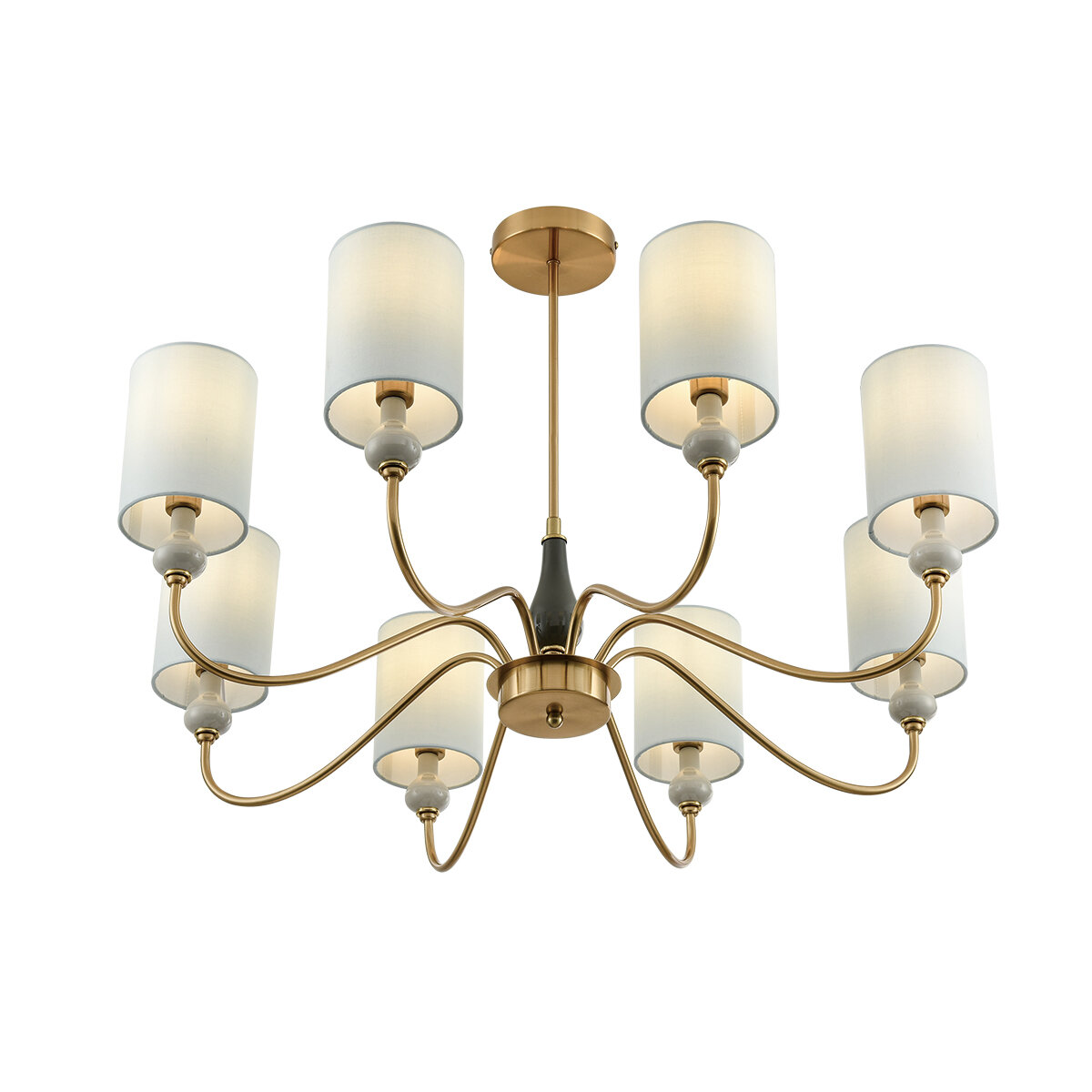 Если ваш интерьер выдержан в классическом стиле, светильники ANRI добавят ему утонченности.Коллекция сочетает в себе металлический каркас цвета латунь с элегантными керамическими деталями белого цвета, придающими светильникам благородный вид. Плафоны выполнены из текстиля нежного мятного зеленого оттенка, что добавляет композиции свежести и легкости.Светильники серии ANRI доступны в вариантах на 5 и 8 ламп. Плавные линии делают их универсальными для использования в гостиных, столовых и спальнях. Декоративный керамический элемент темно-серого цвета, расположенный в центре конструкции, не только добавляет эстетический акцент светильникам, но и гармонично объединяет все его компоненты. Настенные бра ANRI дополняют общий образ интерьера, создавая идеально мягкое освещение для уютных уголков и коридоров.