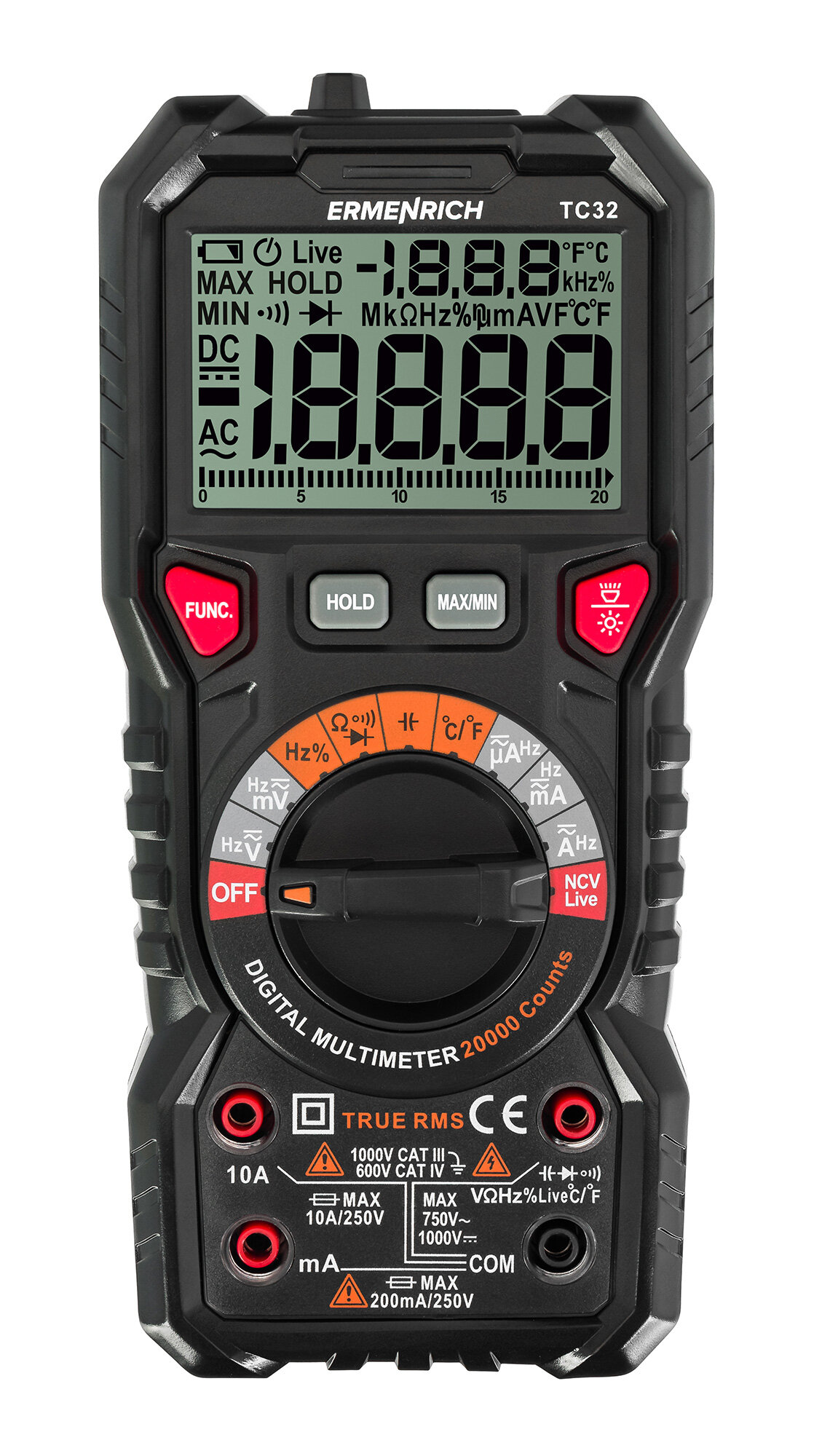 Цифровой мультиметр Ermenrich Zing TC32 объединяет в одном корпусе вольтметр, амперметр, фарадометр, омметр, а также частотомер и измеритель рабочего циклаПреимущества Прибор оснащен термопарой для замеров температуры в пределах от –20 до 1000 °C Диодный тест, проверка цепи на проводимость и детектор фаз с определением их последовательности Встроенный датчик NCV, с помощью которого бесконтактным способом можно найти скрытую проводку или выявить опасное напряжение в проводе Классический поворотный переключатель режимов, пределы измерений при этом устройство выбирает автоматически ЖК-экран с подсветкой, на который мультиметр выводит показания, имеет наглядную графическую шкалу Результаты измерений можно «заморозить» на дисплее («Hold»), чтобы вернуться к ним позднее. Устройство также фиксирует минимумы и максимумы, полученные при замерах Переменные величины мультиметр рассчитывает по методу True RMS (истинного среднеквадратичного значения), что гарантирует высокую точность показаний Для работы в темноте можно использовать фонарик, который есть на верхнем торце мультиметра Для экономии питания предусмотрено автоматическое отключение устройства, а о близящейся разрядке комплекта сообщит индикатор на экране Питание от 2 батареек типа АА