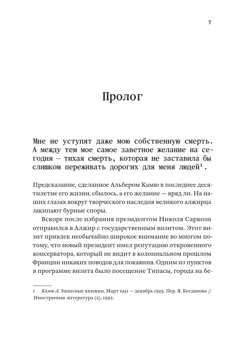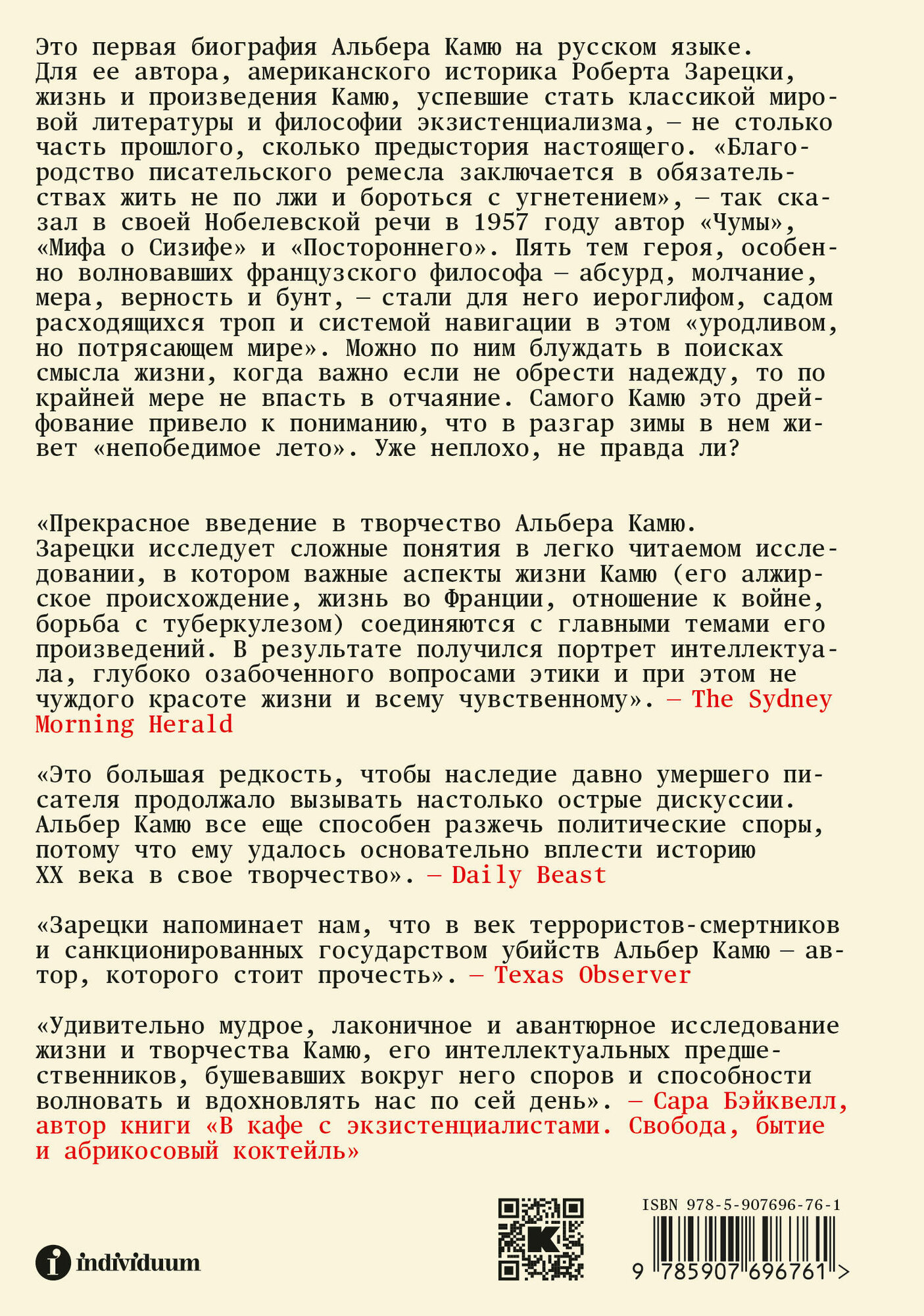 Это первая биография Альбера Камю на русском языке. Для ее автора, американского историка Роберта Зарецки, жизнь и произведения Камю, успевшие стать классикой миро- вой литературы и философии экзистенциализма, — не столько часть прошлого, сколько предыстория настоящего. «Благородство писательского ремесла заключается в обязательствах жить не по лжи и бороться с угнетением», — так сказал в своей Нобелевской речи в 1957 году автор «Чумы», «Мифа о Сизифе» и «Постороннего». Пять тем героя, особенно волновавших французского философа — абсурд, молчание, мера, верность и бунт, — стали для него иероглифом, садом расходящихся троп и системой навигации в этом «уродливом, но потрясающем мире». Можно по ним блуждать в поисках смысла жизни, когда важно если не обрести надежду, то по крайней мере не впасть в отчаяние. Самого Камю это дрейфование привело к пониманию, что в разгар зимы в нем живет «непобедимое лето». Уже неплохо, не правда ли?