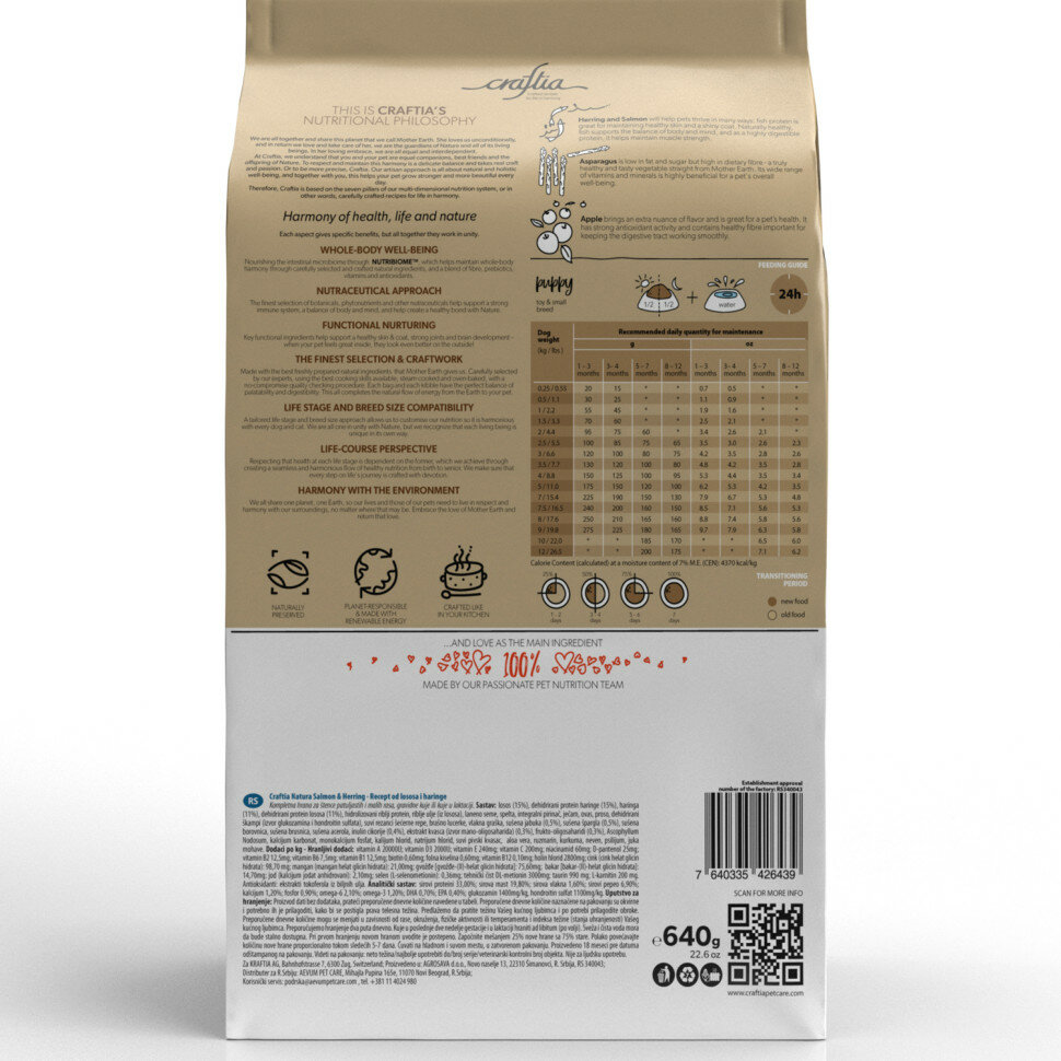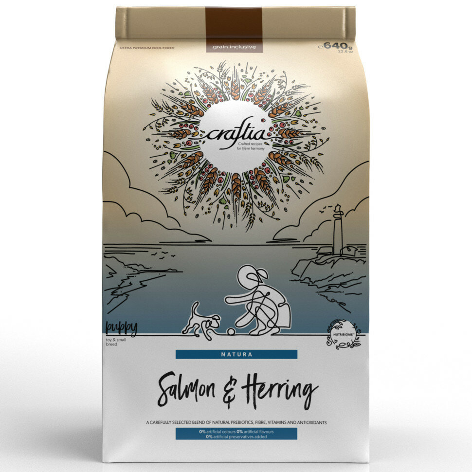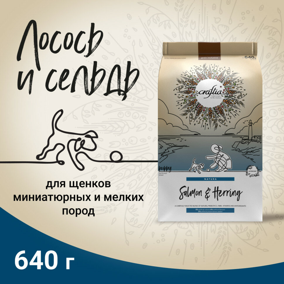 Сухой корм Craftia natura для щенков миниатюрных и мелких пород из лосося с сельдью 640 г Crafita