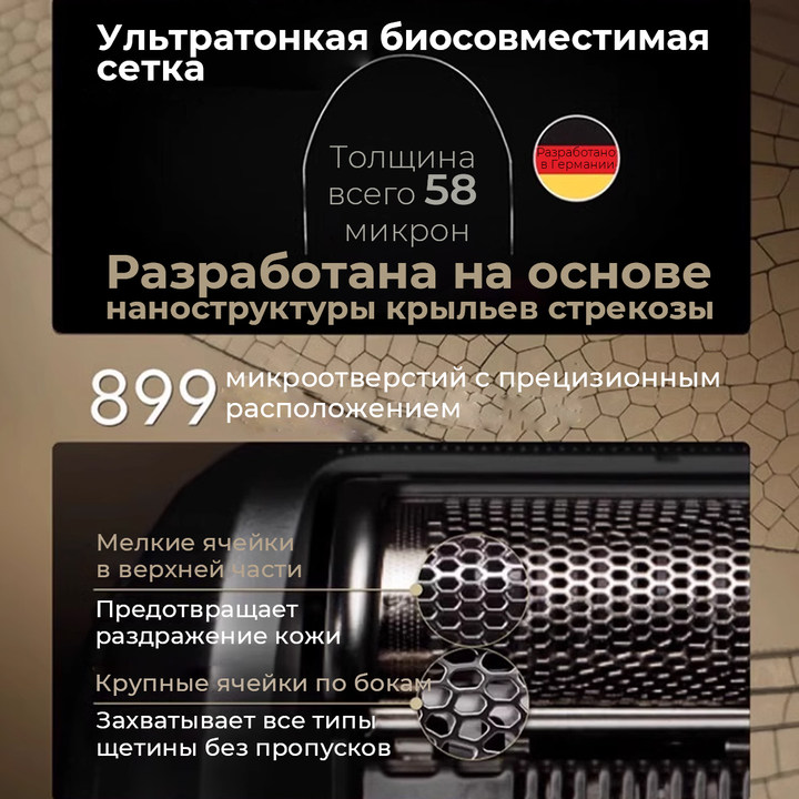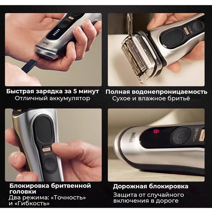 Бритва нового уровня: обновленный дизайн, обеспечивающий более гладкое бритье, комфорт для кожи и точность, 4 бритвенных элемента с звуковым приводом обеспечивают чистое и бережное бритье даже для густой бороды. ProT для максимальной эффективности стрижки даже бакенбардов, усов и под носом. Водонепроницаемая, мощный литий-ионный аккумулятор, обеспечивающий время работы 60 минут.
