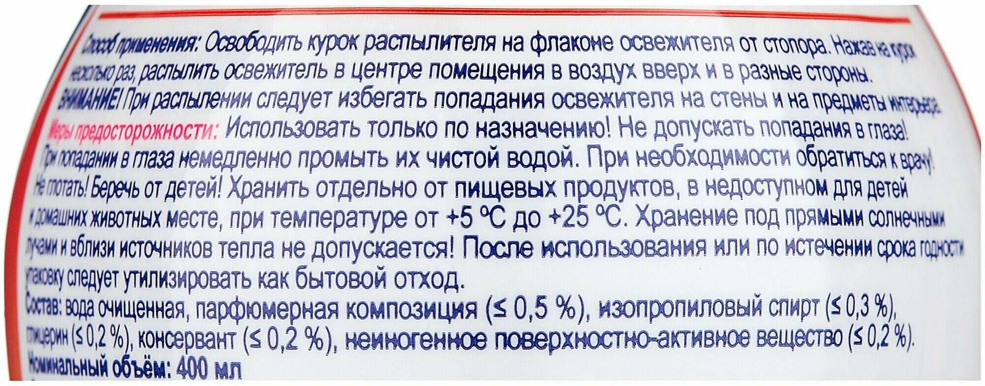 | Химический состав | Вода, пропиленгликоль, глицерин, изопропиловый спирт, менее 5% парфюмерная композиция, менее 5% консервант |