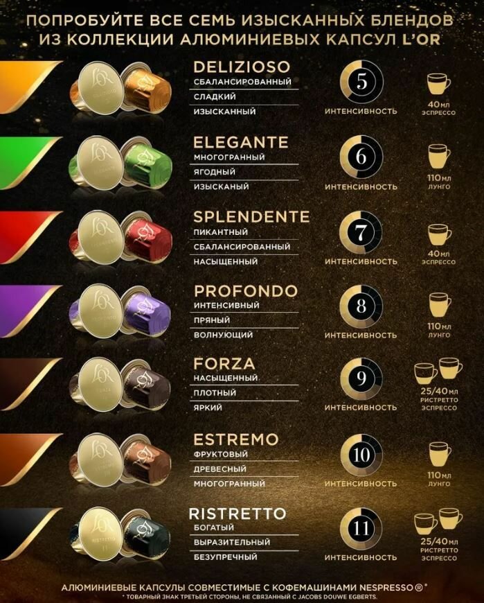 Эспрессо с насыщенным вкусом тёмного шоколада. Богатый и гармоничный купаж с оттенками лёгкой сладости, едва уловимой горчинкой и ярким шоколадным послевкусием. Создано профессионалами L’or.