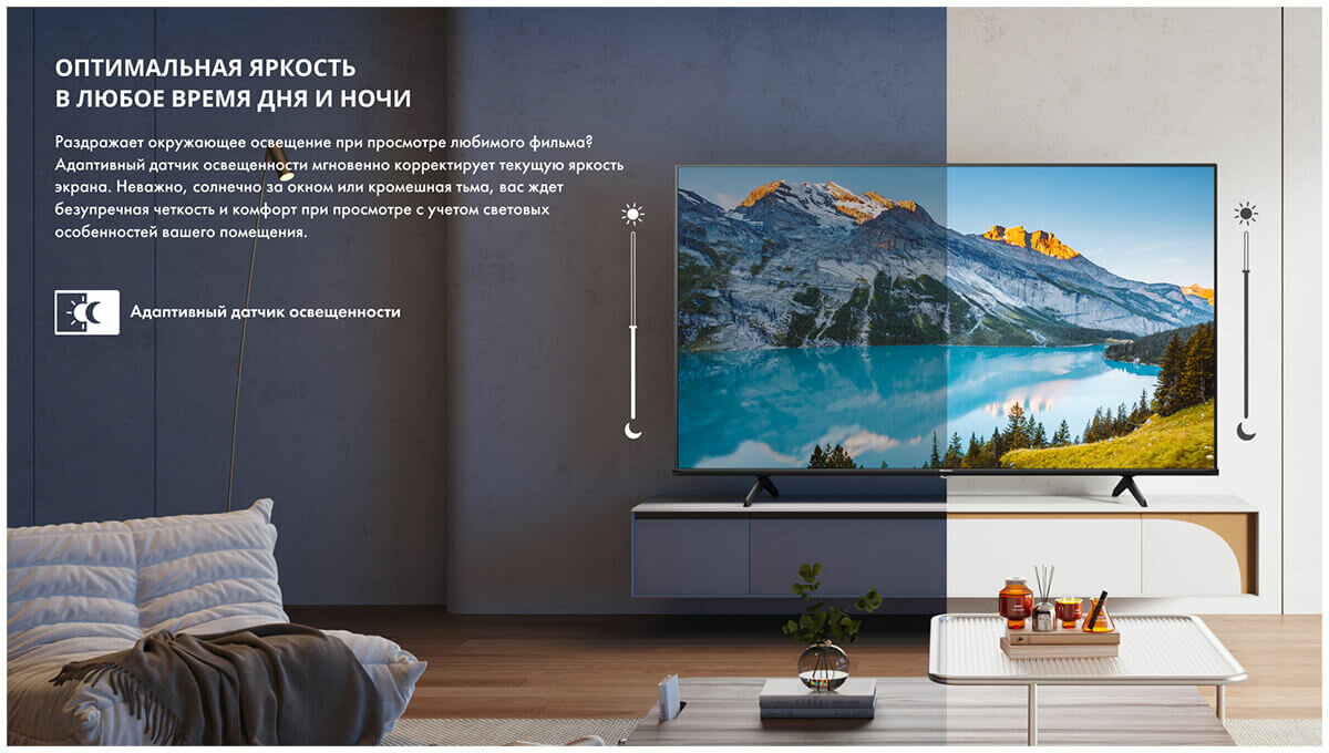 Раздражает окружающее освещение при просмотре любимого фильма? Адаптивный датчик освещенности мгновенно корректирует текущую яркость экрана. Неважно, солнечно за окном или кромешная тьма, вас ждет безупречная четкость и комфорт при просмотре с учетом световых особенностей вашего помещения.ПОГРУЗИТЕСЬ В ПРОИСХОДЯЩЕЕ