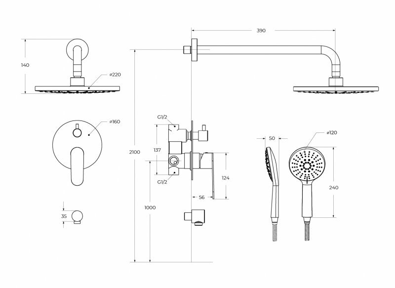 | Комплект поставки | Душевой шланг, душевая лейка, держатель для душа, верхний душ, кронштейн для душа |