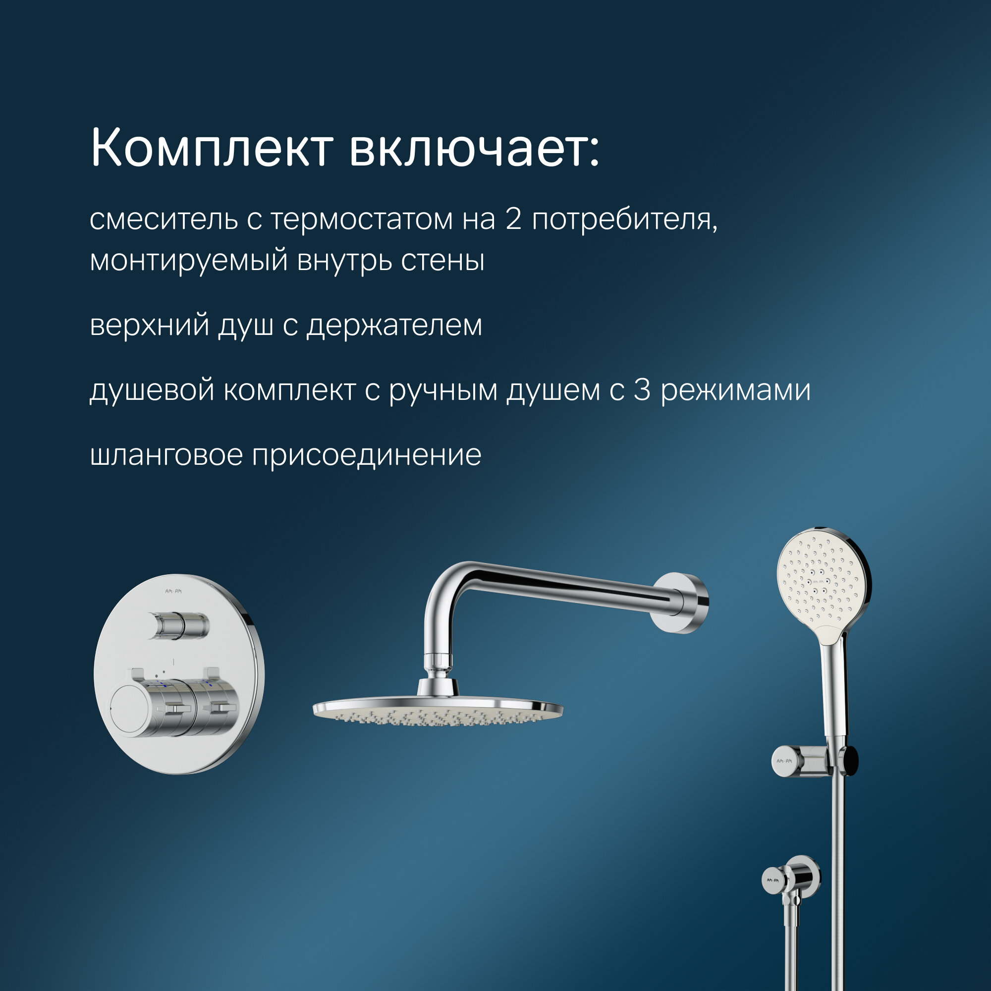 Коллекция X-Joy включает в себя по-настоящему дизайнерские продукты в своем ценовом сегменте. Разработанные дизайн-агентством GP designpartners из Австрии, они завоевали любовь многих покупателей.Набор встроенного оборудования X-Joy - идеальное решение для вашей ванной комнаты. Встроенный механизм освобождает ванную комнату от лишних деталей, превращая пространство в идеальное место для себя. Набор включает в себя: верхний тропический душ 22 см, ручной душ, держатель ручного душа и смеситель.Высокопроизводительный Коаксиальный картридж с термостатом, включающий высокочувствительный термоэлемент, обладает быстрой реакцией на изменения температуры или давления в водопроводной сети, защищает от ожога даже при внезапном отключении холодной воды.Удобные ручки управления потоком и температурой воды расположены на одном уровне, что позволяет менять режимы легко и просто. Смеситель имеет удобный переключатель сразу на 3 выхода, что является эффективным инженерным решением в сантехнической отрасли.Покрытие Everlast вдвое превышает отраслевые стандарты по прочности и износостойкости. Ювелирный блеск и прочность покрытия достигаются по стандарту Chrome plating standard NSS 80H. Отдельная гарантия производителя на корпус и покрытие 10 лет, в два раза больше чем принято по европейским стандартам.КомплектацияСмеситель для ванны и душа, излив, верхний душ с держателем, душевой набор и шланговое присоединение, инструкция.
