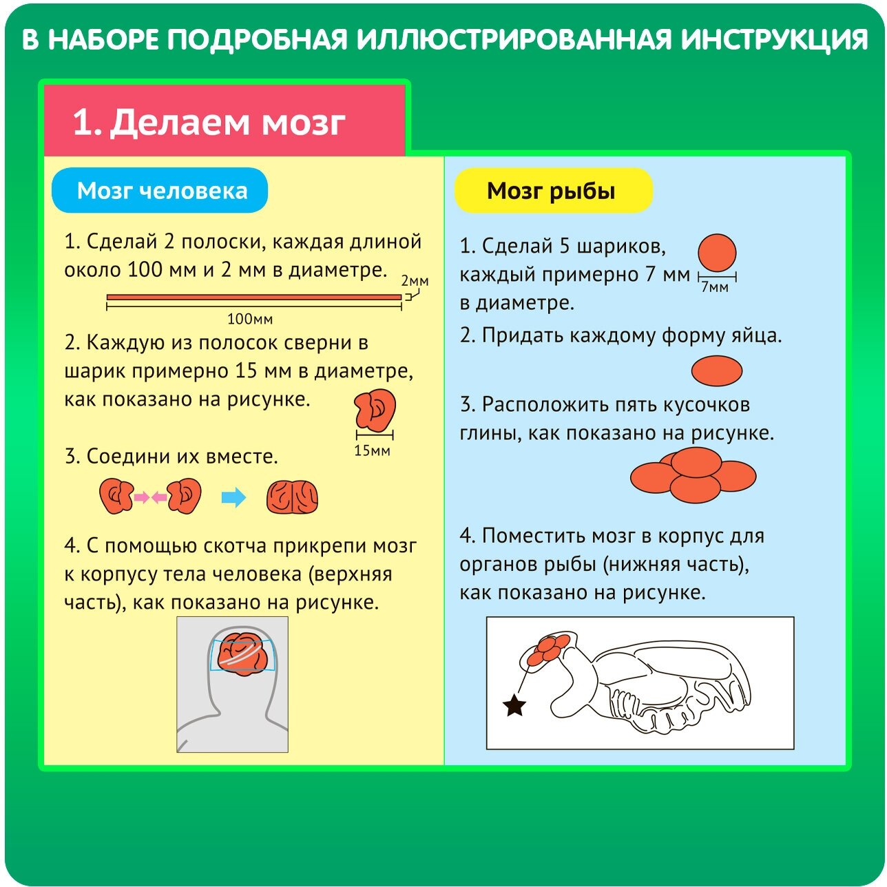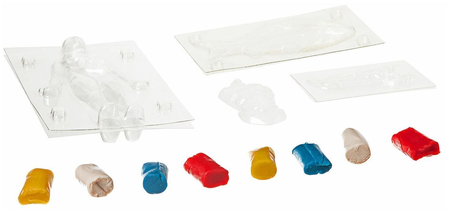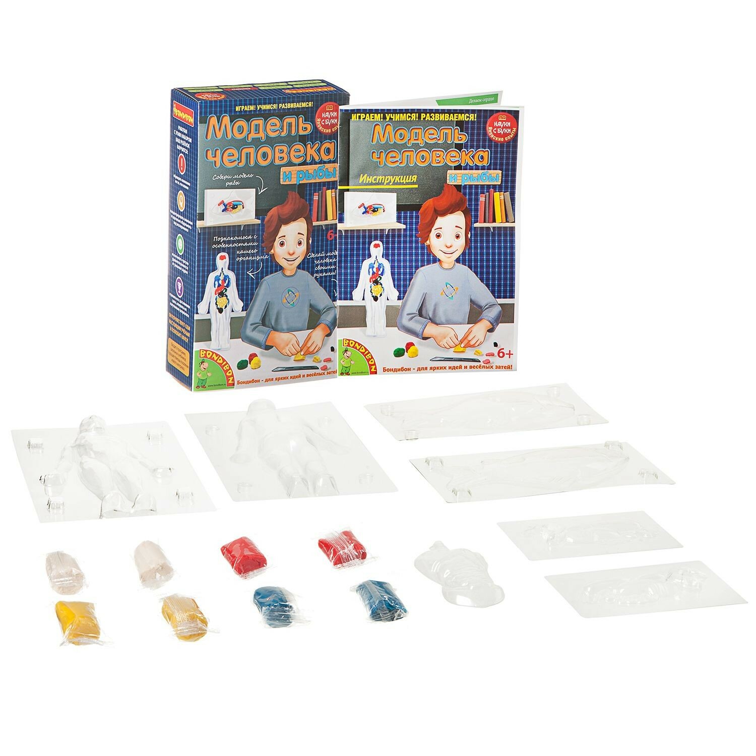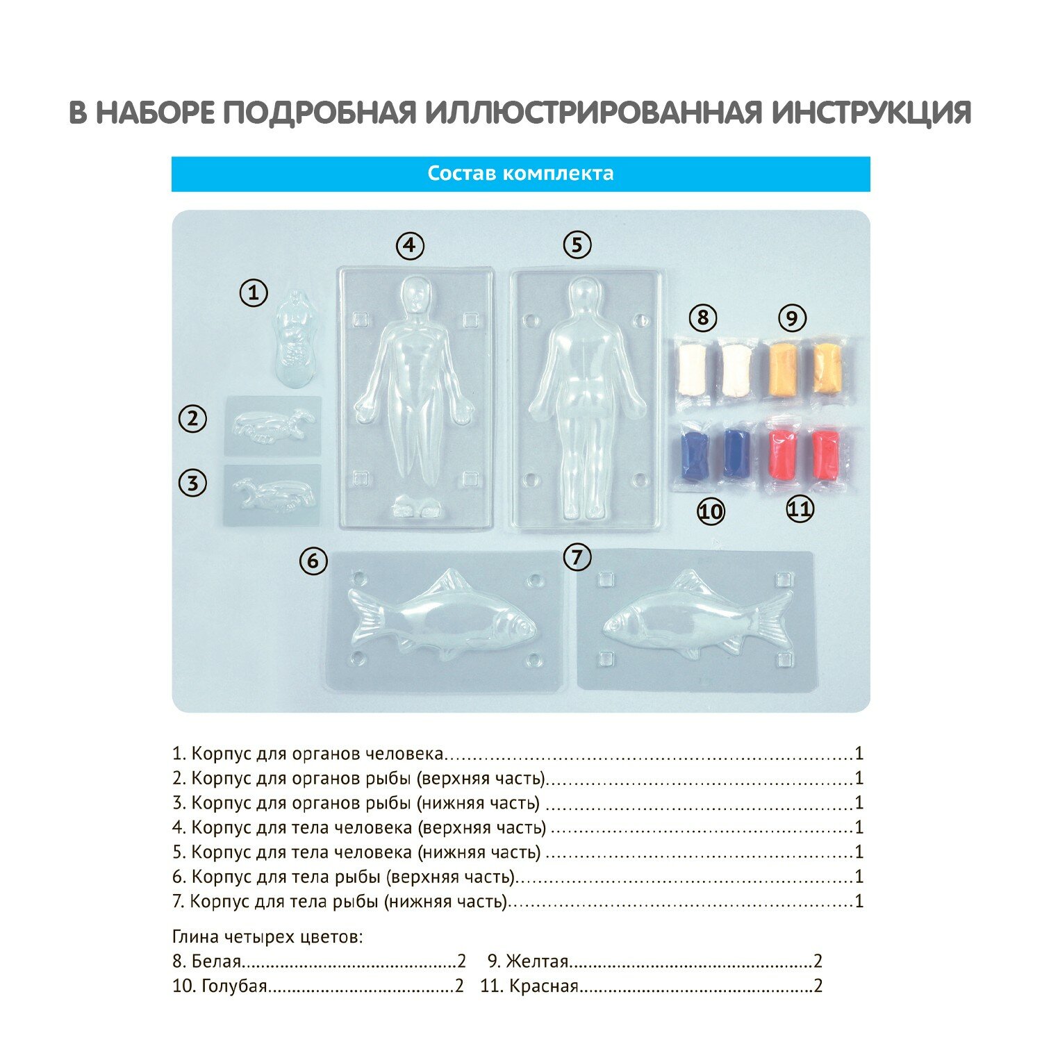 В состав набора входят: корпус для органов человека, корпус для органов рыбы, корпус для тела человека, корпус для тела рыбы, глина четырех цветов, иллюстрированная инструкция.