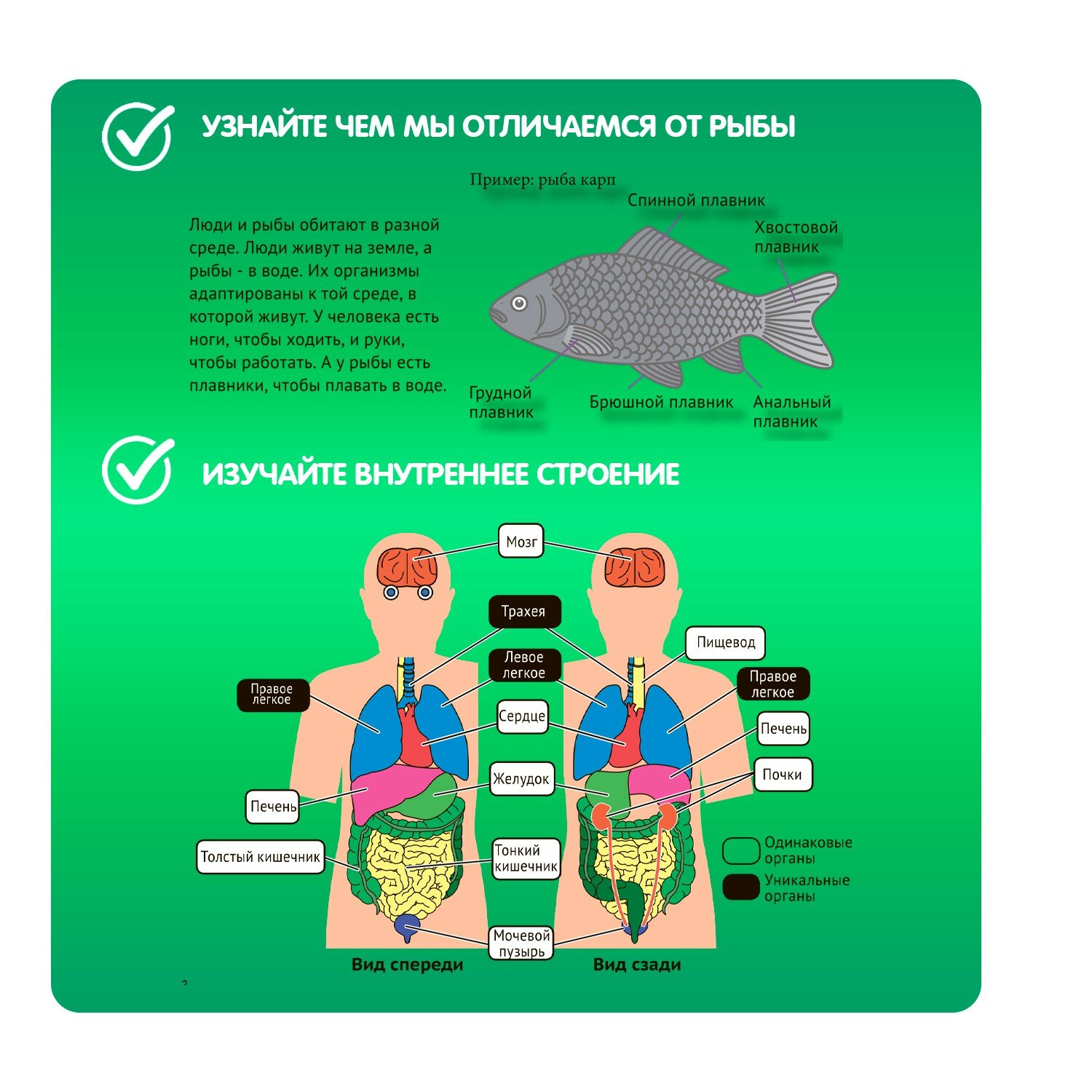 С помощью этого набора детям предстоит создавать модели внутренних органов согласно прилагаемой красочной инструкции. Каждый орган можно выполнить в определенном цвете. Вылепленные органы следует поместить в корпуса, повторяющие тело человека и тело рыбы, и с удивлением узнать, что, несмотря на огромную разницу во внешнем виде, некоторые внутренние органы человека и рыбы одинаковы! Набор поможет ребенку наглядно понять, как устроен организм человека.