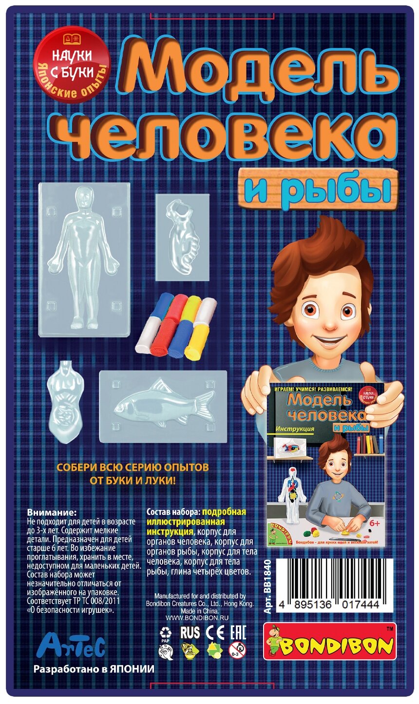 | Комплектация | пластиковая основа человека и рыбы, пластилин, бумажные листы. |