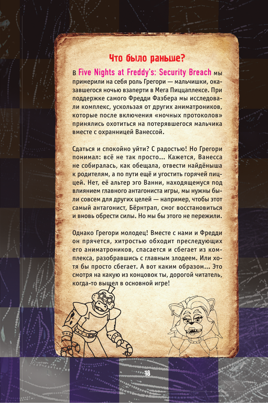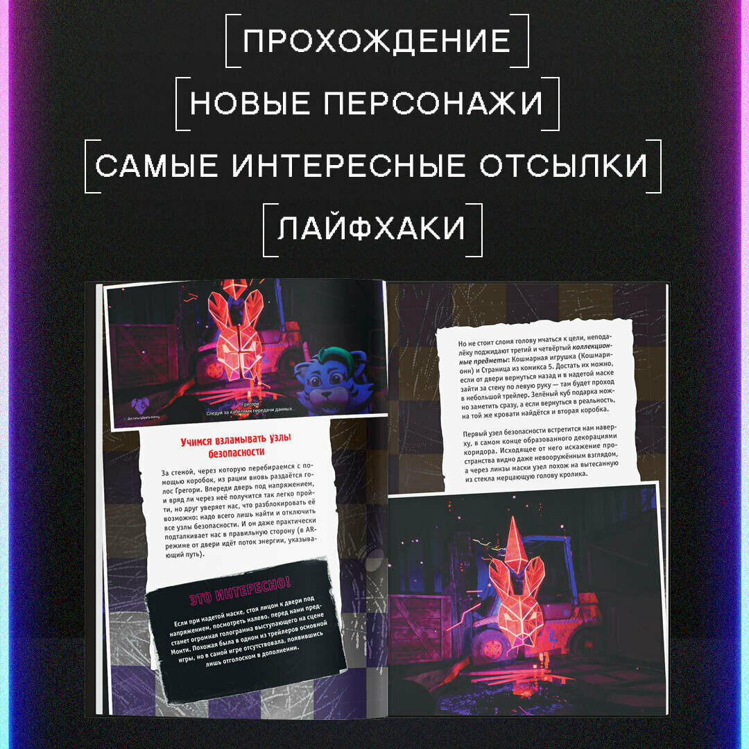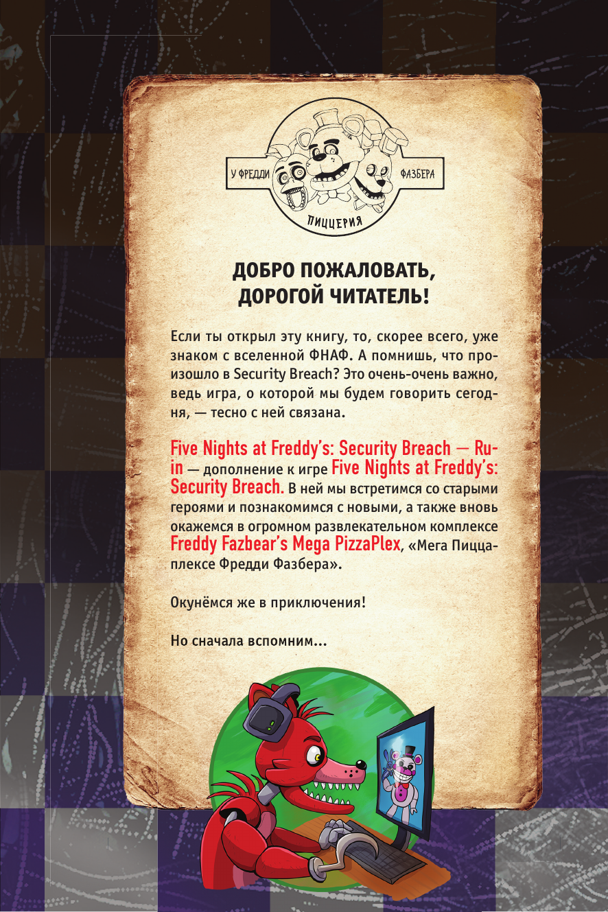 Гайд по игре из вселенной ФНАФ. Что скрывает разрушенный Пиццаплекс? Абсолютно новая информация, этого нет ни в одной книге! Дополнение "Секьюрити Брич: Руины" расскажет историю, которая происходит через много месяцев после завершения основной игры. Мы вновь окажемся в огромном "Мега Пиццаплексе Фредди Фазбера", встретимся со старыми героями и познакомимся с новыми. Внутри вы найдете подсказки по прохождению, лайфхаки, самые интересные отсылки, скрины из игры и многое другое. Как изменилась Глэмрок Чика? Кто такой Мимик? Что случилось с Грегори после финала "Секьюрити Брич"? Что стало с Пиццаплексом после пожара? Скорее раскрой все секреты дополнения!