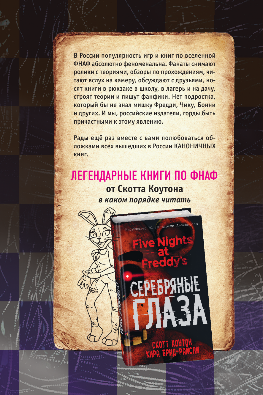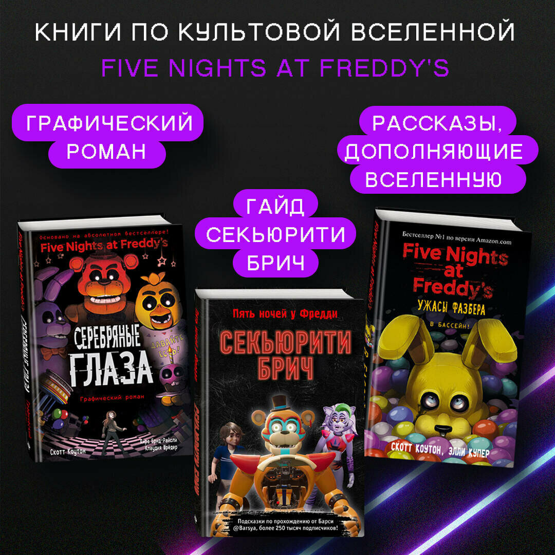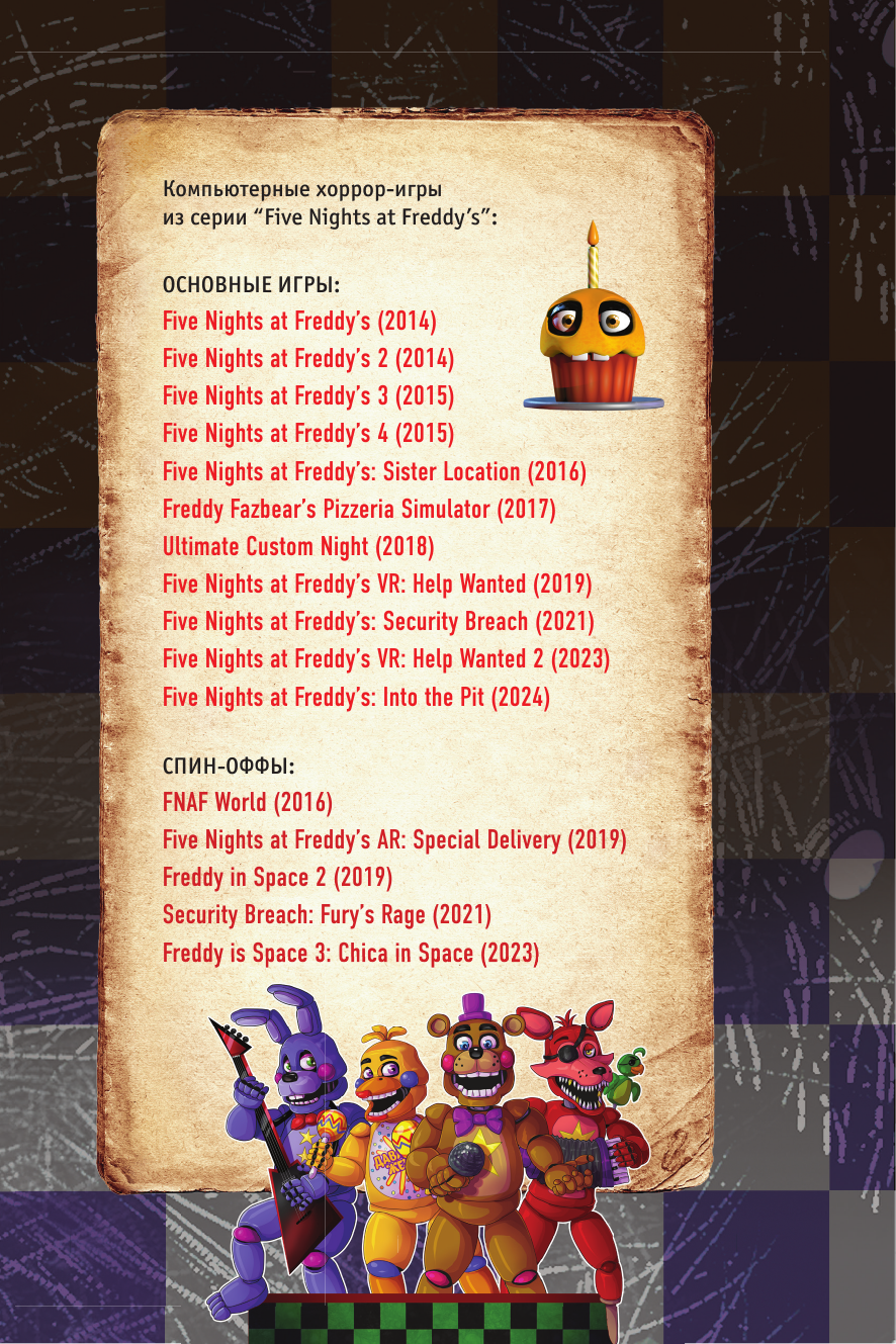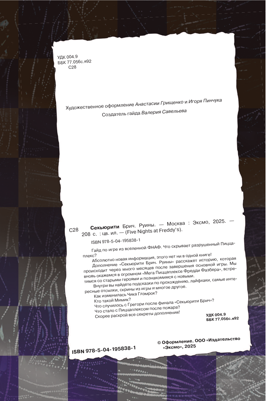 Гайд по игре из вселенной ФНАФ. Что скрывает разрушенный Пиццаплекс? Абсолютно новая информация, этого нет ни в одной книге! Дополнение "Секьюрити Брич: Руины" расскажет историю, которая происходит через много месяцев после завершения основной игры. Мы вновь окажемся в огромном "Мега Пиццаплексе Фредди Фазбера", встретимся со старыми героями и познакомимся с новыми. Внутри вы найдете подсказки по прохождению, лайфхаки, самые интересные отсылки, скрины из игры и многое другое. Как изменилась Глэмрок Чика? Кто такой Мимик? Что случилось с Грегори после финала "Секьюрити Брич"? Что стало с Пиццаплексом после пожара? Скорее раскрой все секреты дополнения!