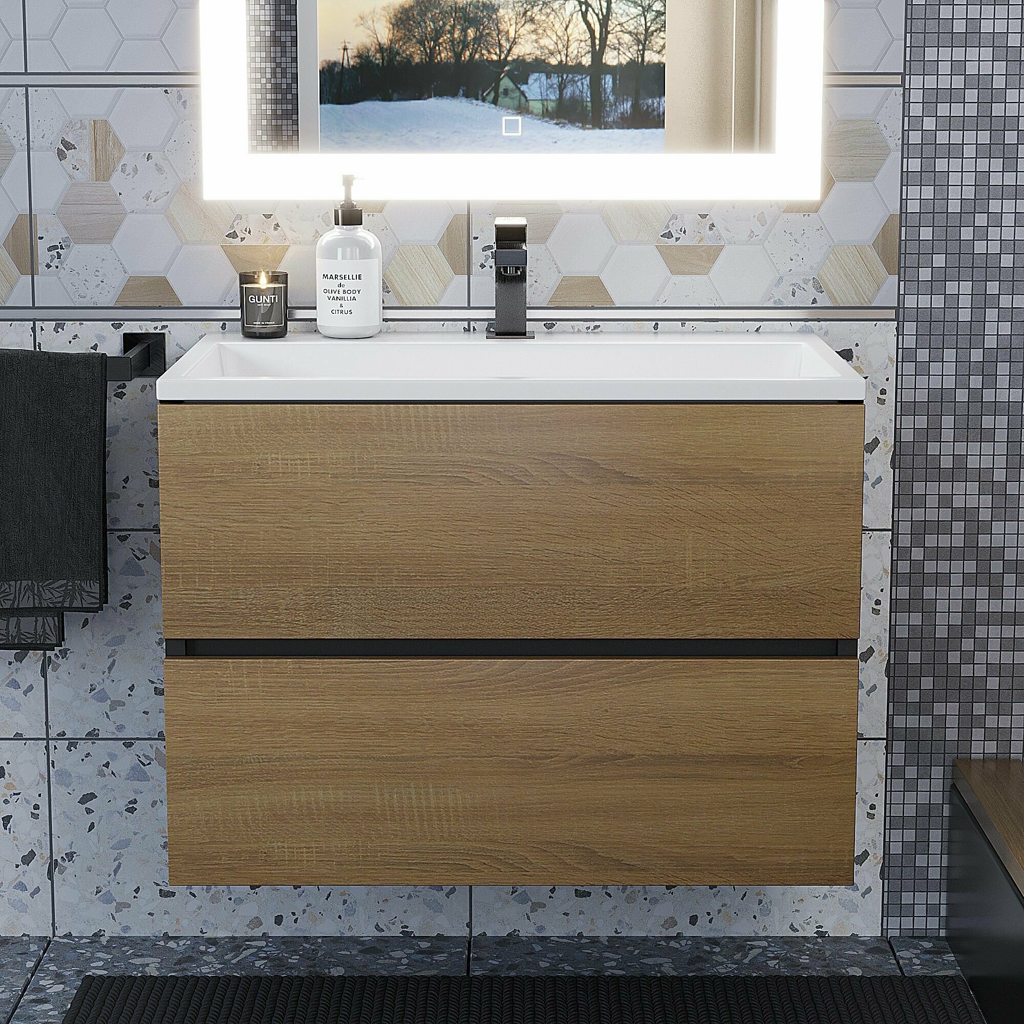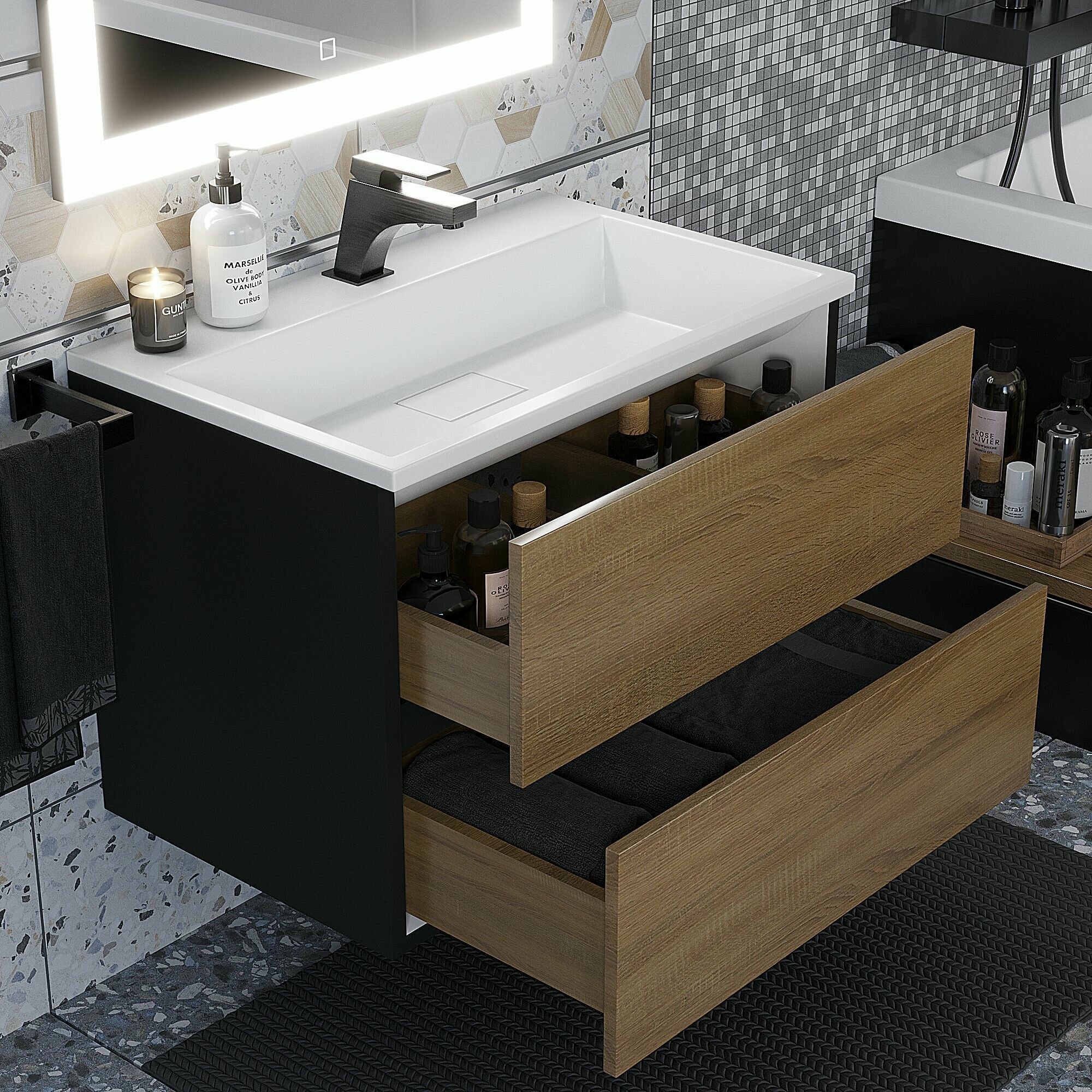 Подвесная тумба под раковину для ванной комнаты из коллекции Uperwood Barsa с двумя выдвижными ящиками представляет собой функциональное, надежное и практичное решение, которое отлично впишется в любой современный интерьер ванной комнаты.Подвесной монтаж изделия обеспечит легкость в уборке помещения и визуально даст больше пространства Вашей ванной комнате.Боковые стенки изделия, выполненные из МДФ, покрыты эмалью Hesse (производство Германия) черного и белого цвета. Толщина МДФ 16 мм.Фасад - ЛДСП в пленке под дерево цвет "дуб сонома". Выдвижные ящики изготовлены из влагостойкой ЛДСП.Ящики оснащены доводчиками. Вся фурнитура и доводчики премиум-класса.Размерный ряд тумб под раковину для ванной Uperwood Barsa представлен моделями от 50 до 100 см.Для тумб Uperwood Barsa подходят раковины Uperwood Barsa соответствующих размеров черного или белого цвета на выбор покупателя.Тумба поставляется в собранном виде, в комплект входит крепеж для подвесного монтажа. Дополните Ваш комплект из тумбы и раковины Uperwood Barsa подвесным шкафом-пеналом из коллекции Barsa белого (арт. 293020529) или черного цвета (арт. 293020545). Также можно собрать полноценный комплект, добавив зеркало с led-подсветкой из коллекции Uperwood Barsa.
