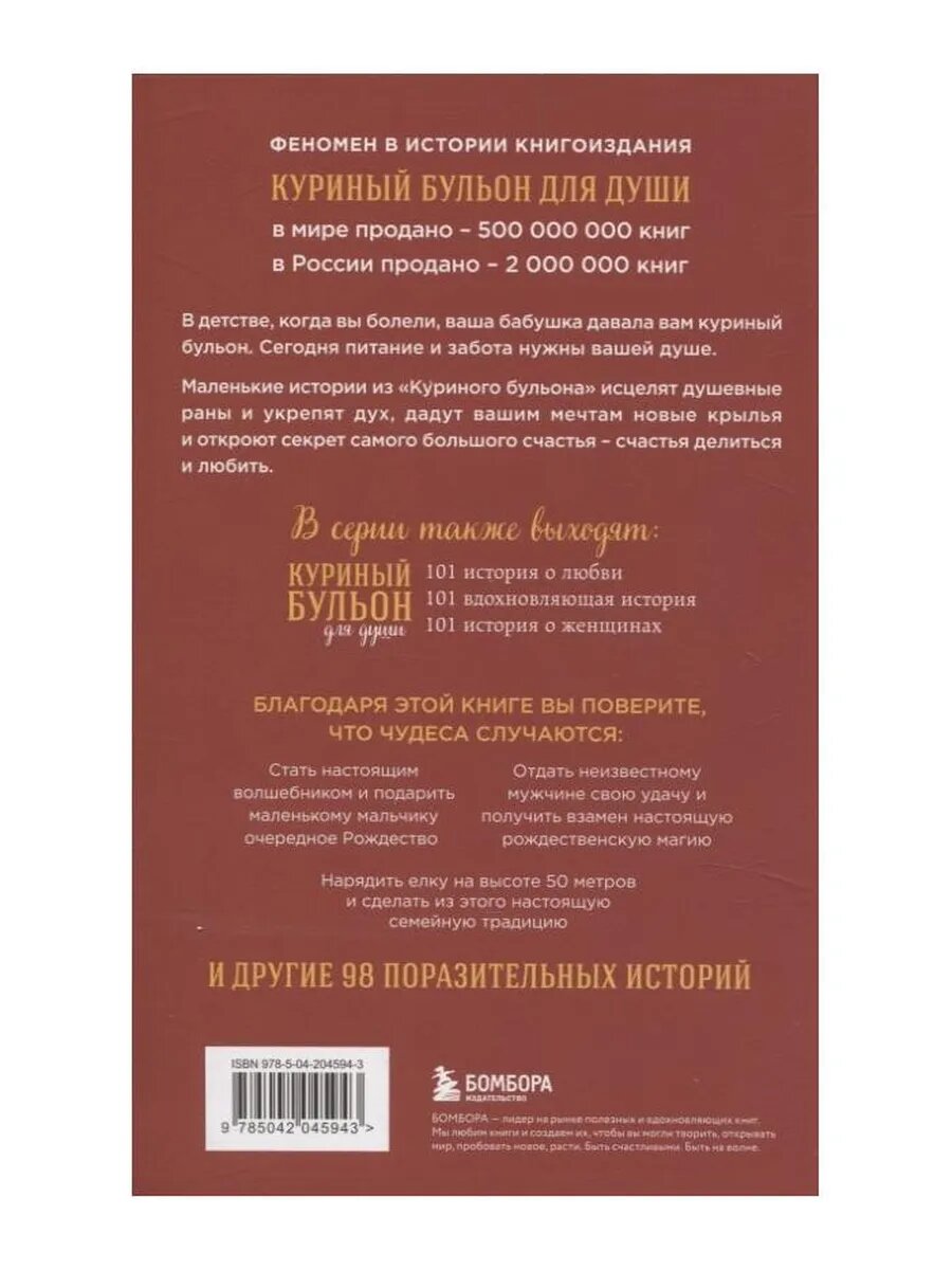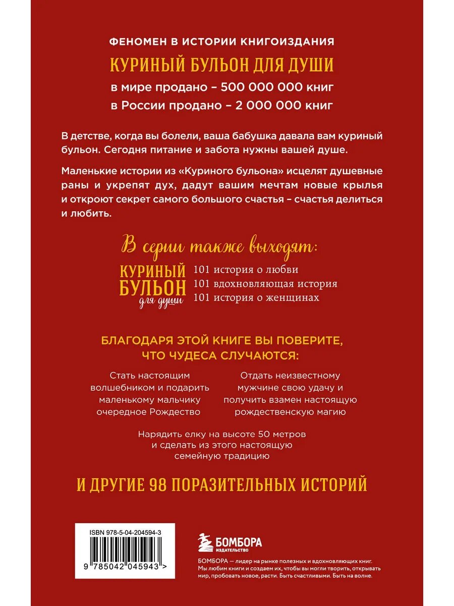 На сегодняшний день товар «Книга: Куриный бульон для души: Дух Рождества. 101 история о самом чудесном времени в году (новое оформление) (Ньюмарк Эми); Эксмо, 2024» можно купить с кешбеком в 1 магазине: book24