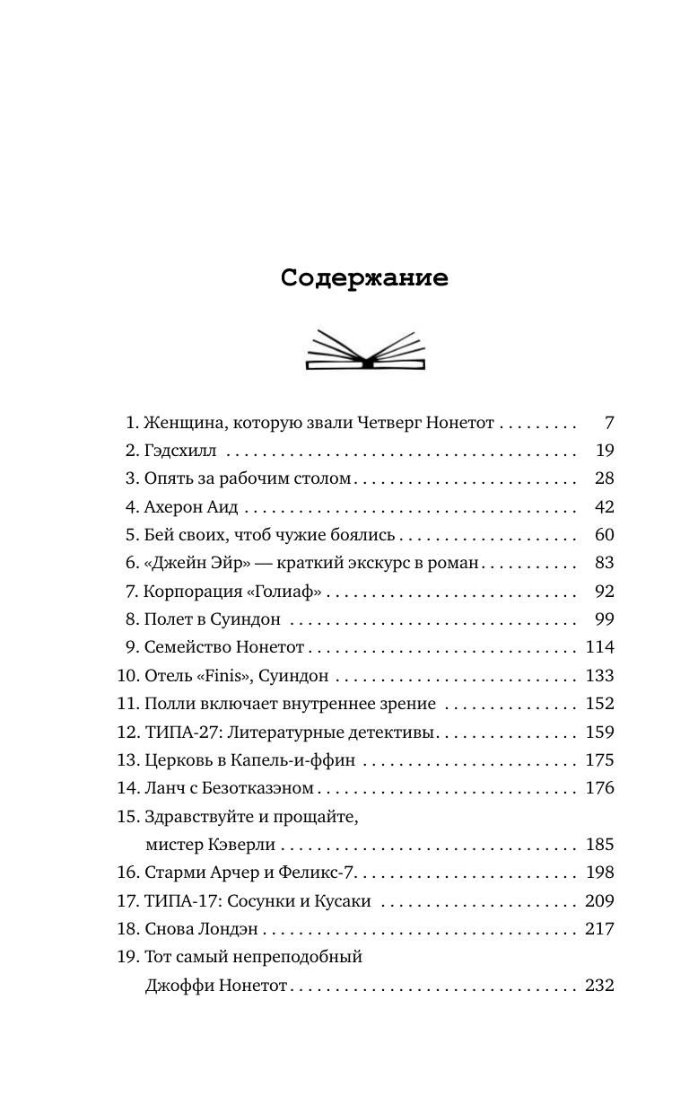 Встречайте Четверг Нонетот, литературного детектива, незаменимую, без страха и упрека. А также встречайте альтернативную версию Великобритании 1985 года, где путешествия во времени — обычное дело, клонирование — реальность (дронты стали самыми любимыми воскрешенными домашними питомцами), а к литературе относятся очень, очень серьезно. Англия — государство, где тетя может заблудиться (в буквальном смысле) в стихах Уодсворта, воинствующие бэконианцы хулиганят на спектаклях по «Гамлету», а подделка стихотворений Байрона является уголовно наказуемым делом. Все это — обычное дело для Четверг, знаменитого литтектива, пока кто-то не начинает похищать персонажей из литературных произведений.