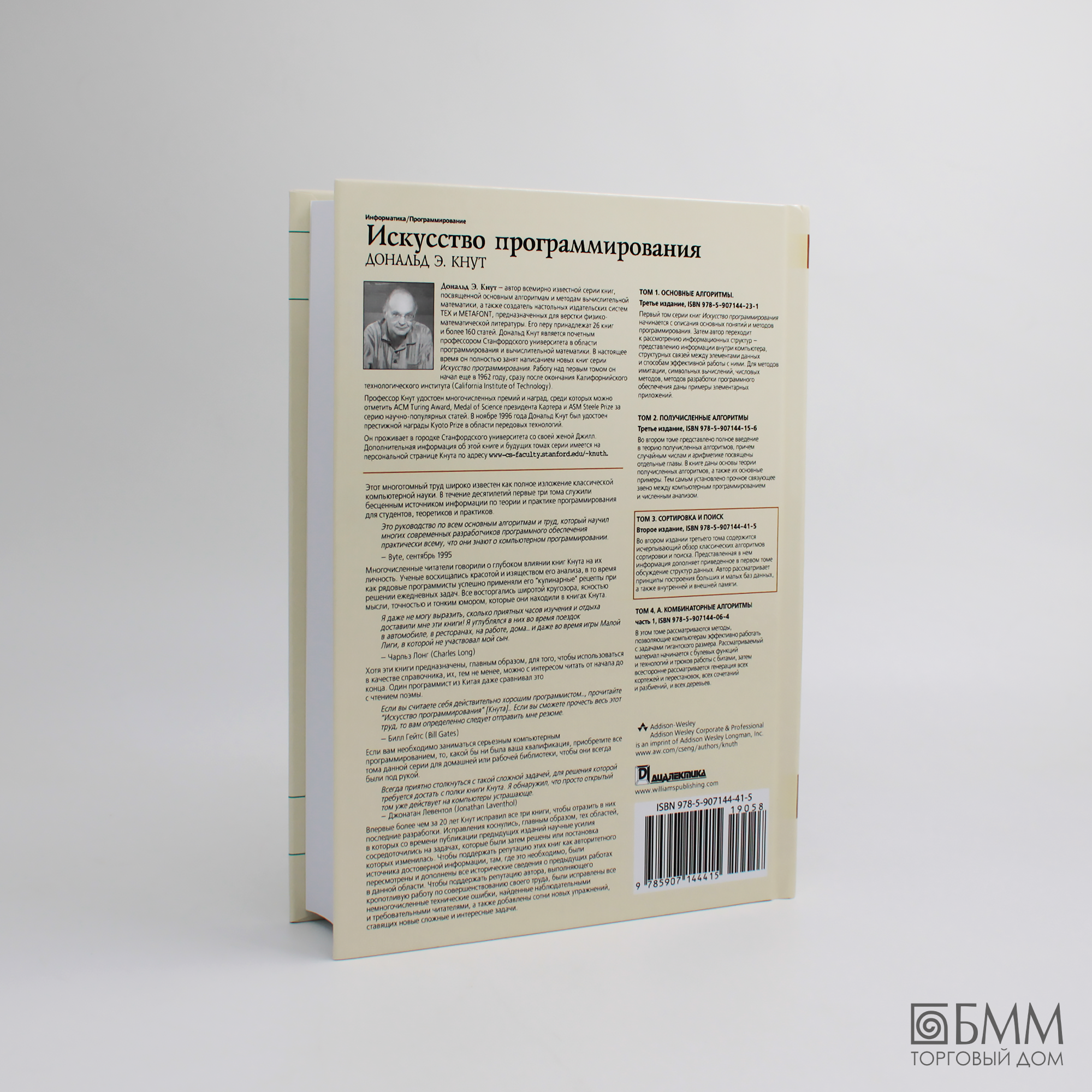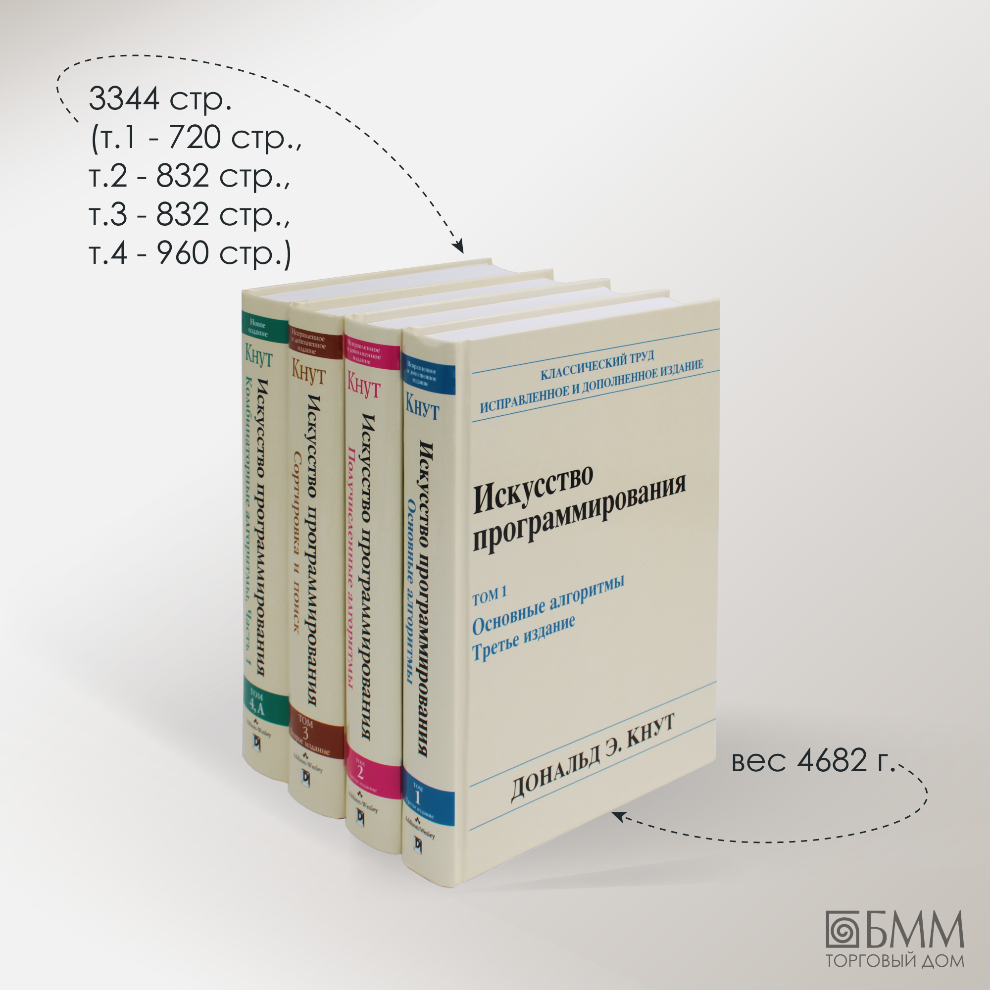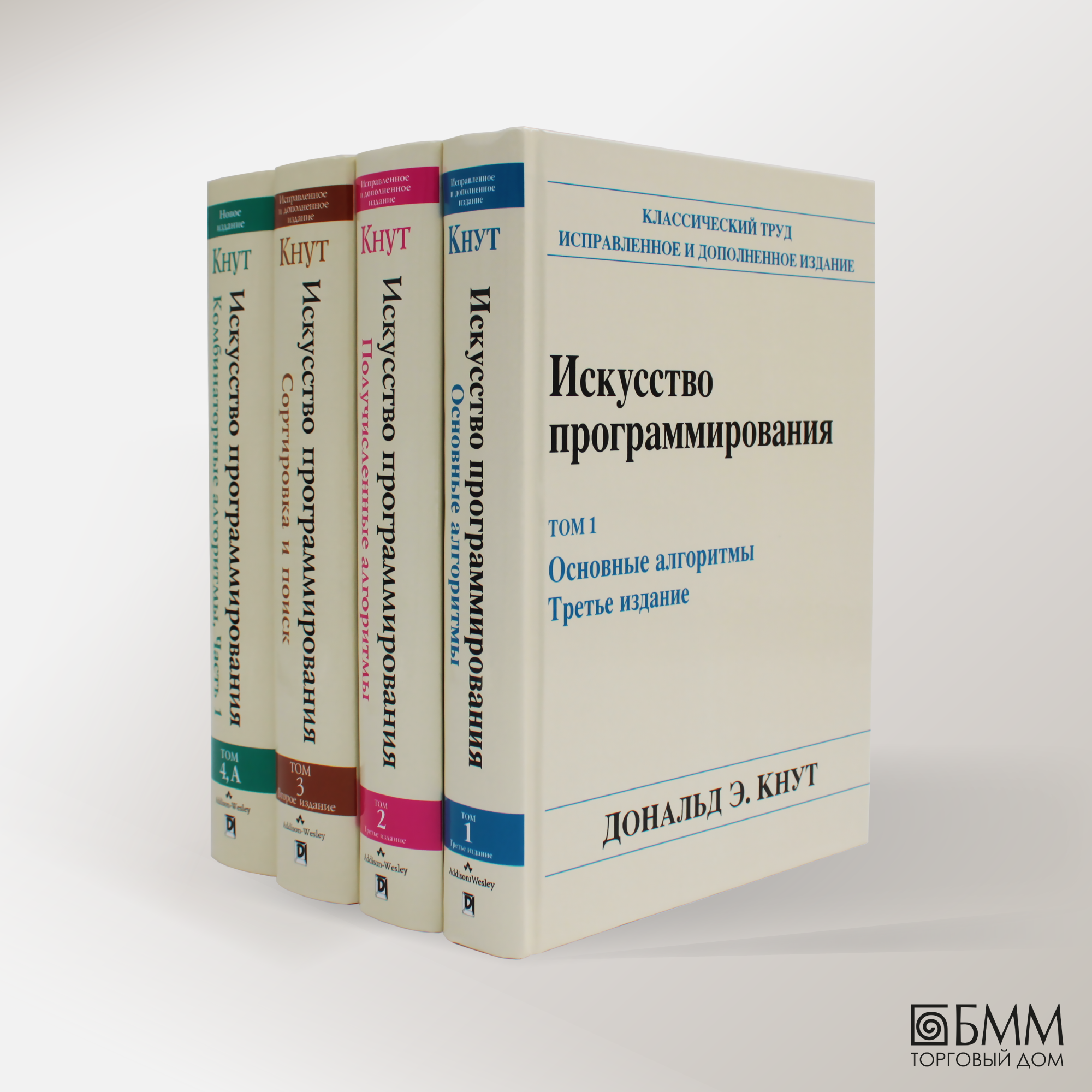 Комплект состоит из четырех томов "Искусства программирования" Д.Э. Кнута. Первый том серии книг Искусство программирования начинается с описания основных понятий и методов программирования. Затем автор переходит к рассмотрению информационных структур -представлению информации внутри компьютера, структурных связей между элементами данных и способам эффективной работы с ними. Для методов имитации, символьных вычислений, числовых методов, методов разработки программного обеспечения даны примеры элементарных приложений. По сравнению с предыдущим изданием добавлены десятки простых, но в то же время очень важных алгоритмов. В соответствии с современными направлениями исследований был существенно переработан раздел математического введения. Во втором томе представлено полное введение в теорию получисленных алгоритмов, причем случайным числам и арифметике посвящены отдельные главы. В книге даны основы теории получисленных алгоритмов, а также их основные примеры. Тем самым установлено прочное связующее звено между компьютерным программированием и численным анализом. Особого упоминания заслуживает предложенная Кнутом в этом третьем издании новая трактовка генераторов случайных чисел, а также рассмотрение способов вычислений с помощью формальных степенных рядов. Во втором издании третьего тома содержится исчерпывающий обзор классических алгоритмов сортировки и поиска. Представленная а нем информация дополняет приведенное в первом томе обсуждение структур данных. Автор рассматривает принципы построения больших и малых баз данных, а также внутренней и внешней памяти. В четвертом томе рассматриваются методы, позволяющие компьютерам эффективно работать с задачами гигантского размера. Рассматриваемый материал начинается с булевых функций и технологий и трюков работы с битами, затем всесторонне рассматривается генерация всех кортежей и перестановок, всех сочетаний и разбиений, и всех деревьев.