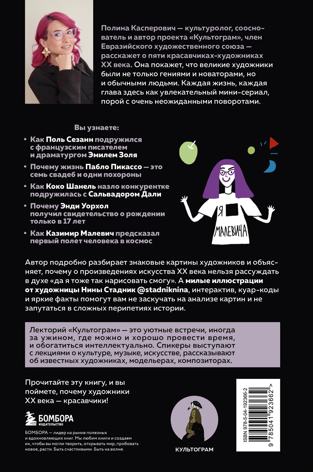 Трогательные и увлекательные истории о жизни, творчестве и становлении самых дерзких художников XX века. Культуролог Полина Касперович рассказывает о них не столько как о гениях, а скорее как об обычных людях. Для автора Энди Уорхол, Казимир Малевич, Пабло Пикассо, Поль Сезанн и Сальвадор Дали — это прежде всего личности со своими страхами, привязанностями, комплексами, забавными увлечениями. Но при этом они также остаются бунтарями и настоящими красавчиками, которые опередили свое время и изменили мир.