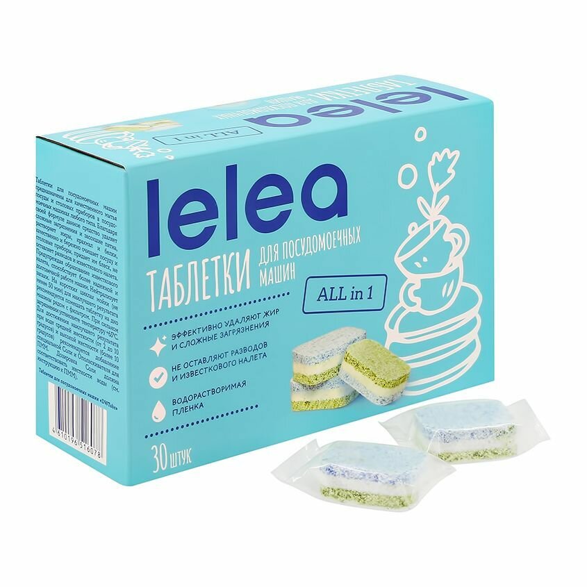 Таблетки для посудомоечной машины Lelea ALL in 1 многофункциональны и полностью выполаскиваются, удаляя даже самые стойкие загрязнения на посуде при низких температурах, без разводов и неприятного запаха. Они подходят для всех типов посудомоечных машин.