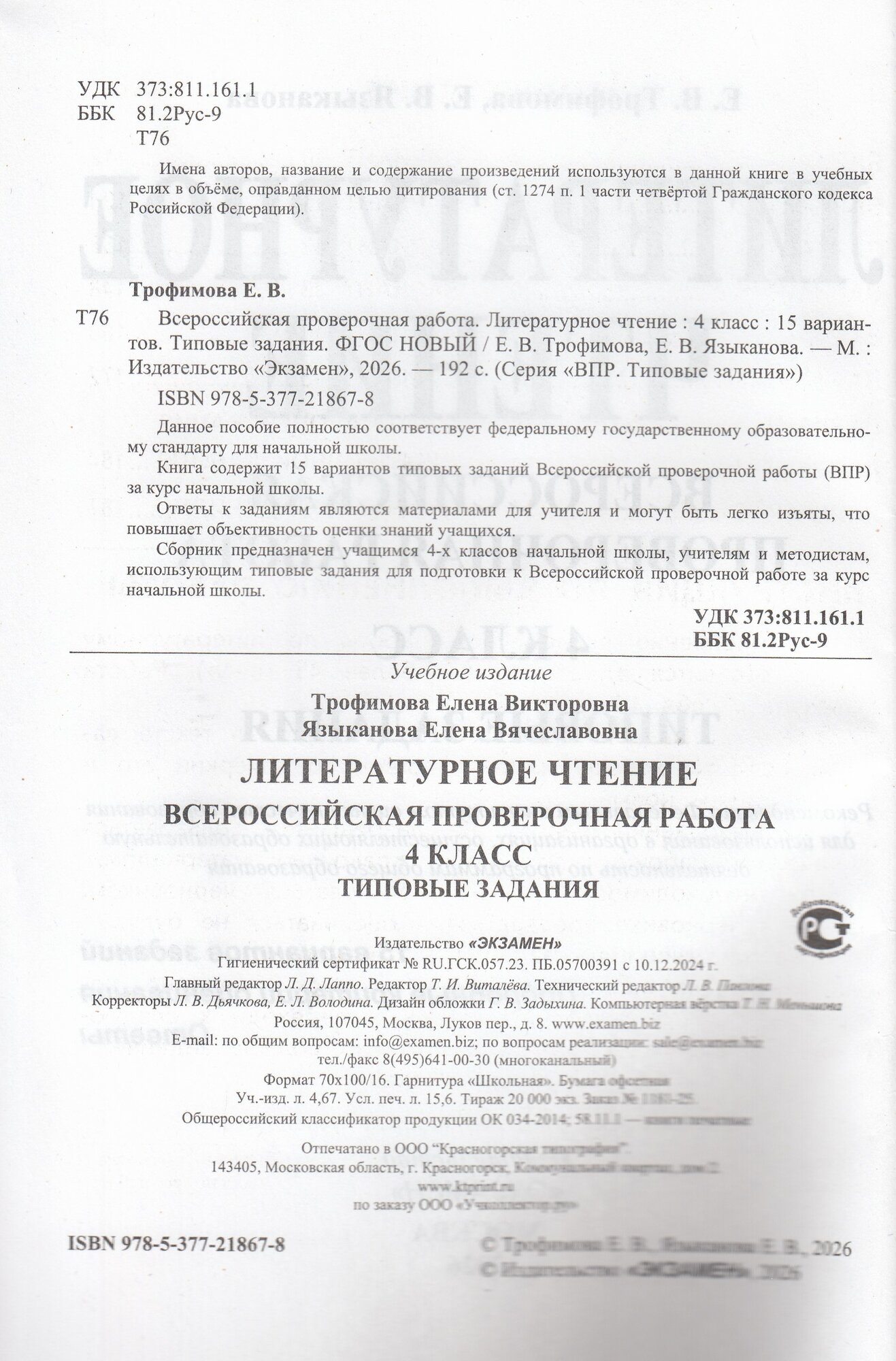 ВПР. Литературное чтение. 4 класс. 15 вариантов. Типовые задания (Елена Викторовна Трофимова, Елена Вячеславовна Языканова); Экзамен, 2026