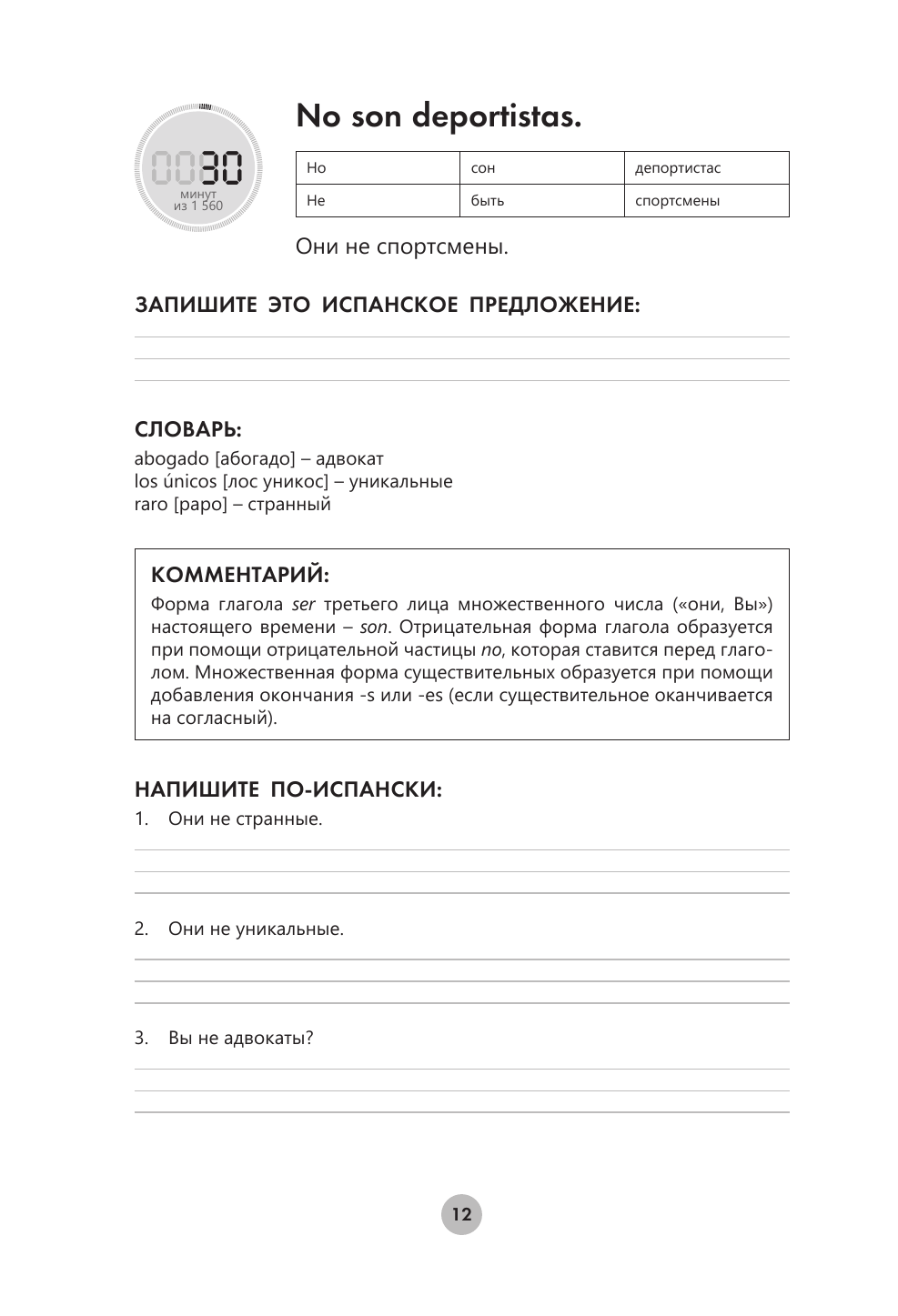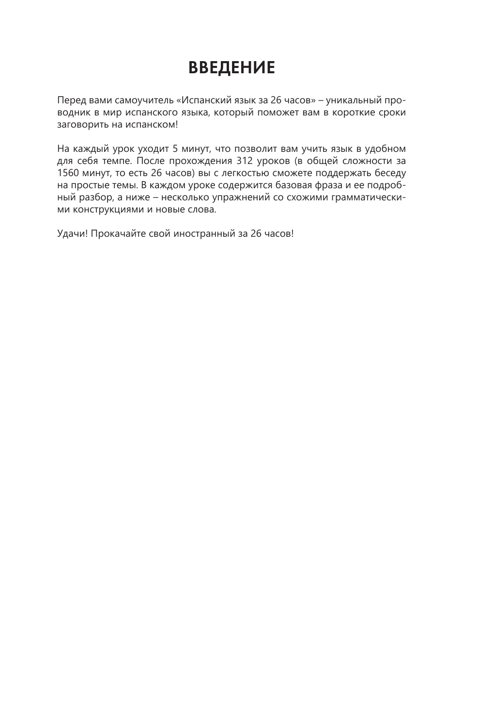 "Испанский язык за 26 часов" — это практический самоучитель, который поможет вам быстро и без усилий овладеть необходимыми грамматическими конструкциями и заговорить на испанском. В каждом уроке дается одно базовое выражение. После прохождения 312 уроков по 5 минут вы сможете легко поддержать беседу на простые темы.