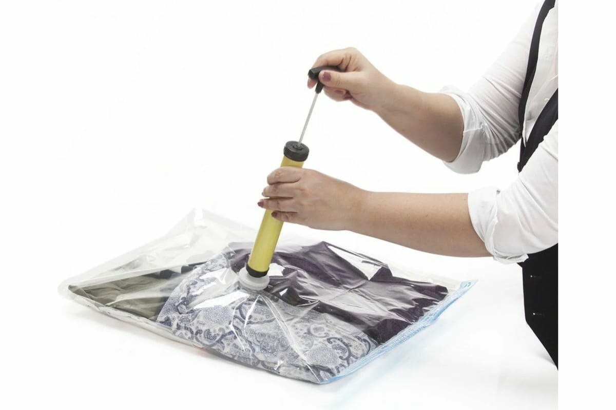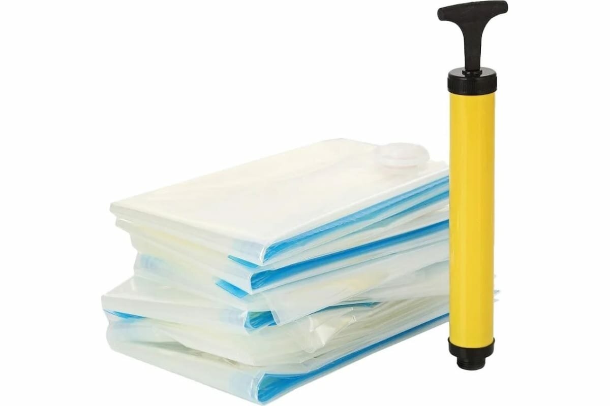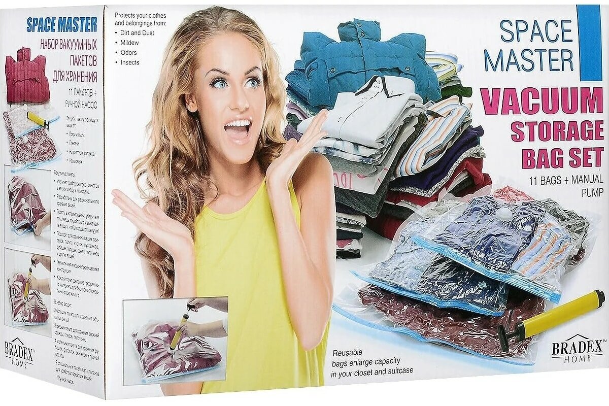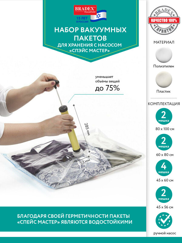 Bradex Набор вакуумных пакетов для хранения с насосом Спэйс мастер с помощью которых Вы найдёте решение Ваших проблем. Они уменьшают объёмы вещей до 75%! Особенности: Достаточно поместить объемную вещь в пакет Спэйс мастер, закрыть его и при помощи насоса, входящего в комплект, присоединенного к специальному отверстию на пакете, откачать воздух, чтобы образовался вакуум. Такой способ хранения, во-первых, экономит пространство в шкафу за счет значительного уменьшения размера вещи, а, во-вторых, оберегает вещь от проникновения пыли, плесени и моли, повреждающих ткань. Пакеты Спэйс мастер оснащены герметичной застежкой и предназначены для многоразового использования. Пакеты подходят как для объёмных зимних вещей для уборки в шкаф в летнее время, так и для более эргономичного укомплектования багажа или для хранения мягких игрушек. Благодаря широкому диапазону размеров пакетов, находящихся в наборе, Вы сможете подобрать нужный размер в зависимости от своих нужд. Благодаря своей герметичности пакеты Спэйс мастер являются также водостойкими и надёжно сохранят Ваши вещи от сырости и влаги.