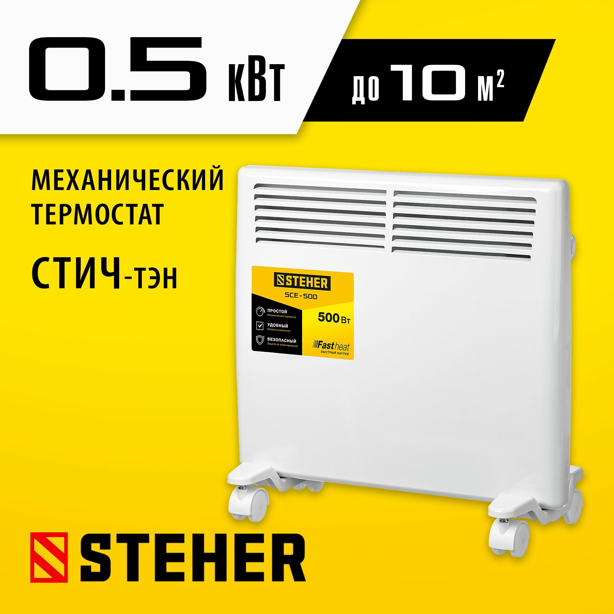 Электрический конвектор STEHER SCE-1000, Е серия, мощностью 1000 Вт - подойдет для обогрева любых домашних и офисных помещений площадью до 15 кв.м.Преимущества Равномерная конвекция воздуха благодаря вентиляционным решеткам на передней и боковых панелях Нагревательный элемент СТИЧ - моментальный нагрев до установленной температуры и остывание Механический терморегулятор Клавиша выключателя Быстросъемный кронштейн для крепления на стене в комплекте Автоматическое выключение при опрокидывании Бесшумная работа Ролики на быстросъемных опорах для напольной установки и перемещения