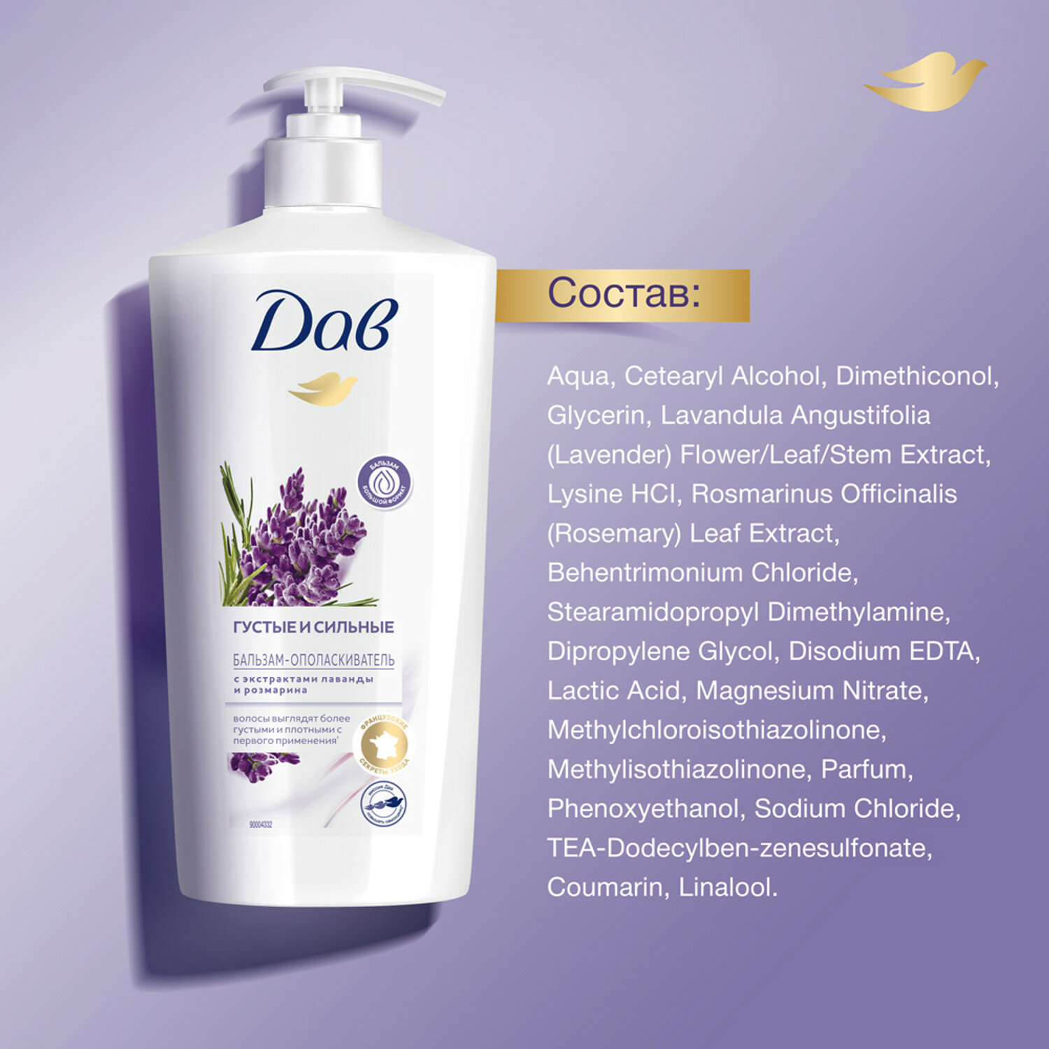 | Химический состав | Aqua, Cetearyl Alcohol, Amodimethicone, Dimethicone, Glycerin, Lavandula Angustifolia (Lavender) Flower/Leaf/Stem Extract, Lavandula Angustifolia (Lavender) Oil, Lysine HCl, Rosmarinus Officinalis (Rosemary) Leaf Extract, Behentrimonium Chloride, Cetrimonium Chloride, Stearamidopropyl Dimethylamine, Dipropylene Glycol, Disodium EDTA, Lactic Acid, Magnesium Nitrate, Methylchloroisothiazolinone, Methylisothiazolinone, Parfum, PEG-7 Propylheptyl Ether, Phenoxyethanol, Sodium Chloride, Alpha-Isomethyl Ionone, Coumarin, Linalool. |