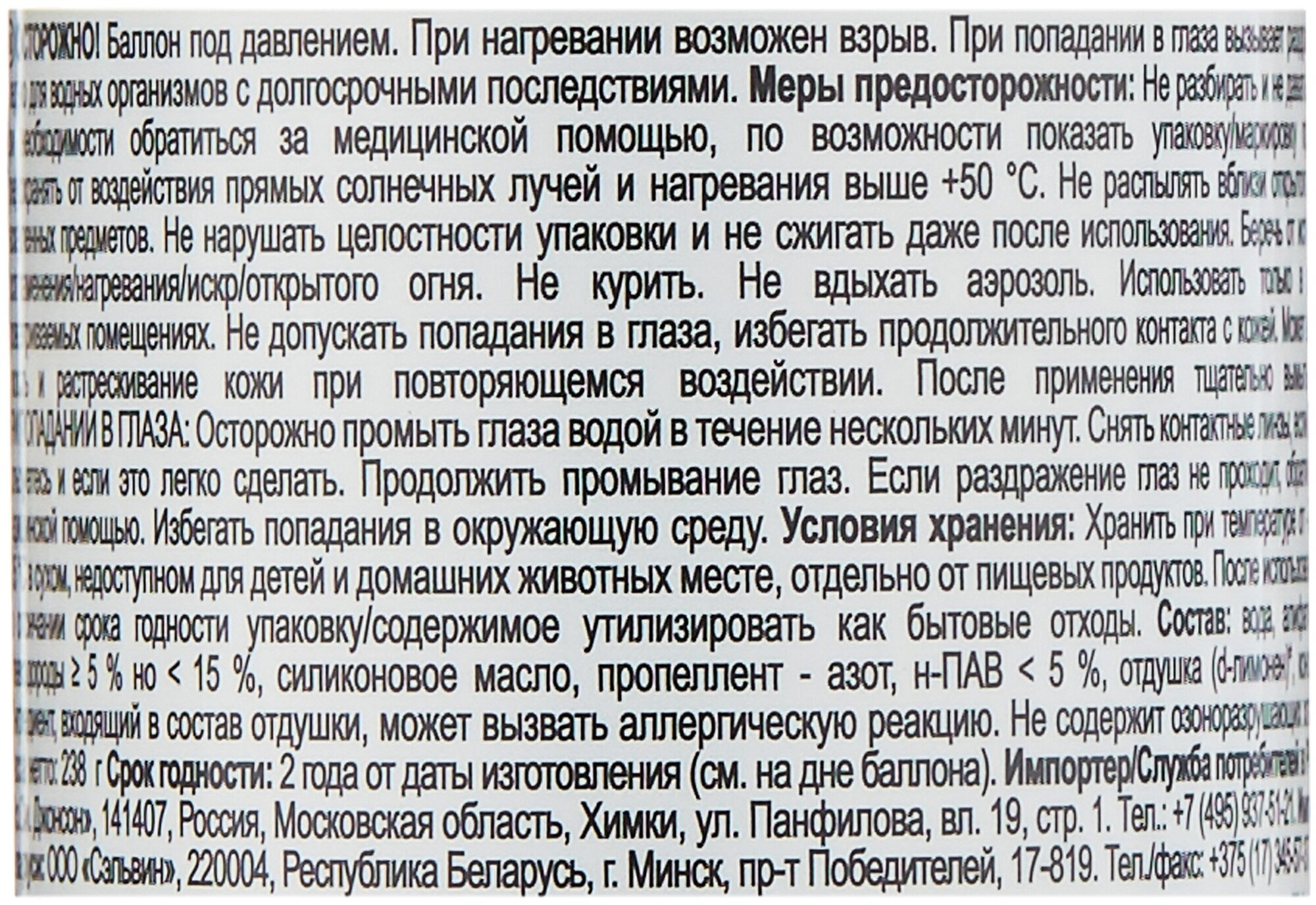 | Химический состав | Вода, ≥ 30 %: пропеллент (изобутан, пропан, бутан), ≥ 5 % но < 15 %: алифатические углеводороды, < 5 % |