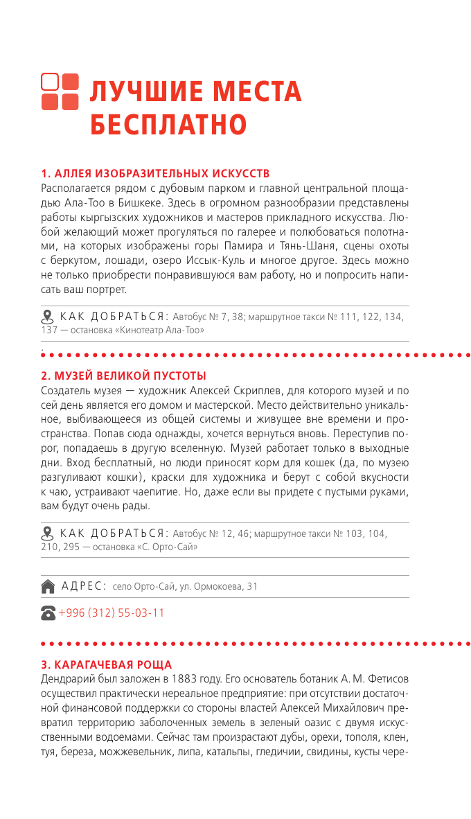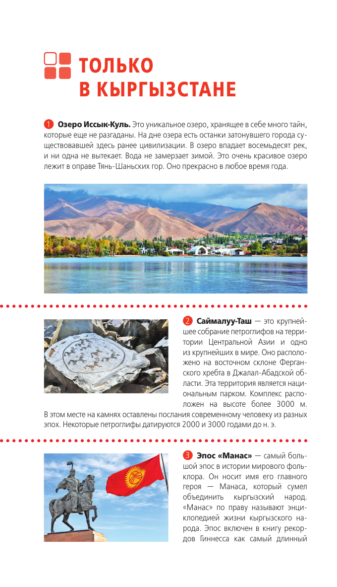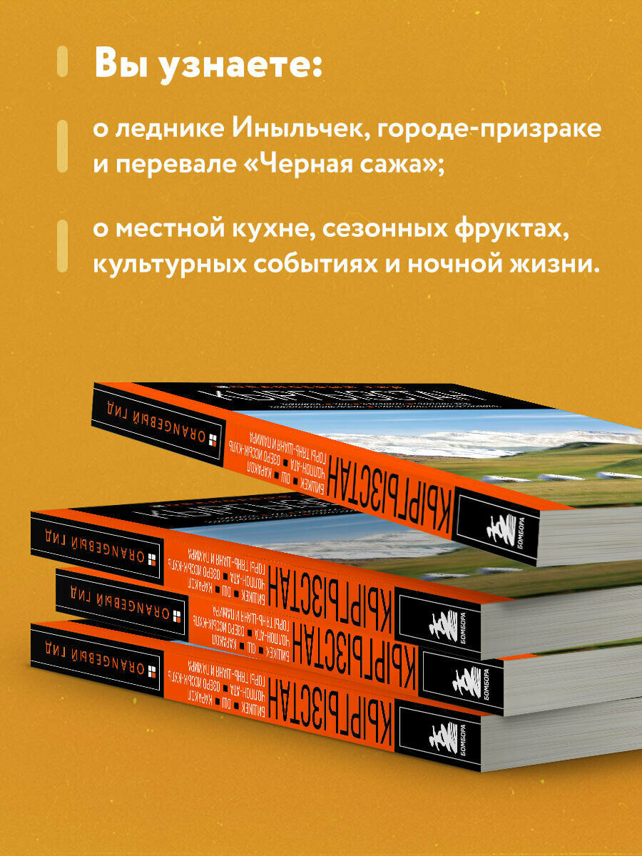 Вы держите в руках путеводитель по гостеприимному Кыргызстану - стране гор, захватывающих природных ландшафтов и удивительной культуры. Оранжевый гид предлагает вам самостоятельно исследовать главные города этой страны и основные достопримечательности. На страницах путеводителя вы найдете только актуальную информацию - интересные музеи, самые лучшие рестораны и бары, увлекательные маршруты. Осталось только выбрать на свой вкус! Прогуляйтесь по солнечному Бишкеку, отправьтесь на озеро с кристально чистой водой Иссык-Куль и прочувствуйте атмосферу колоритного Кыргызстана вместе с Оранжевым гидом!