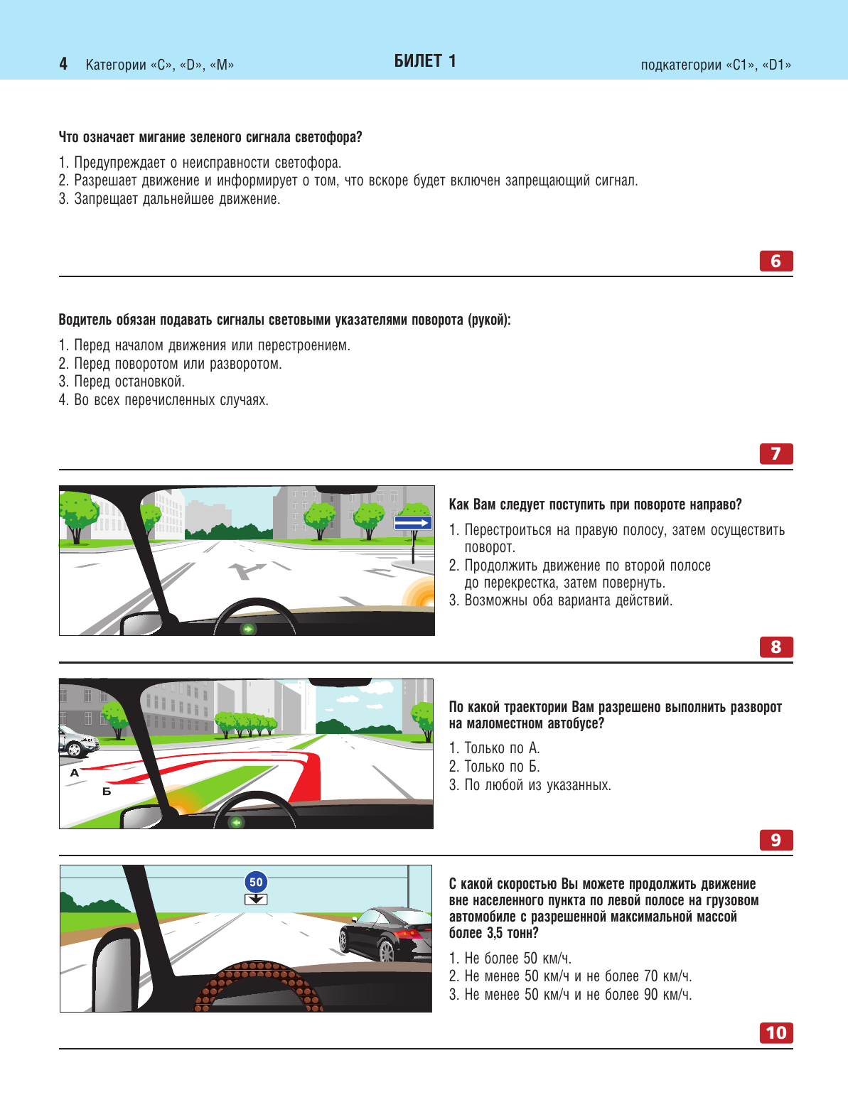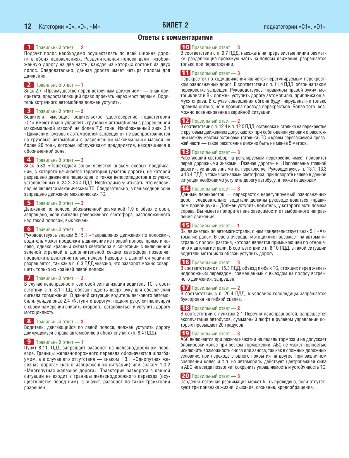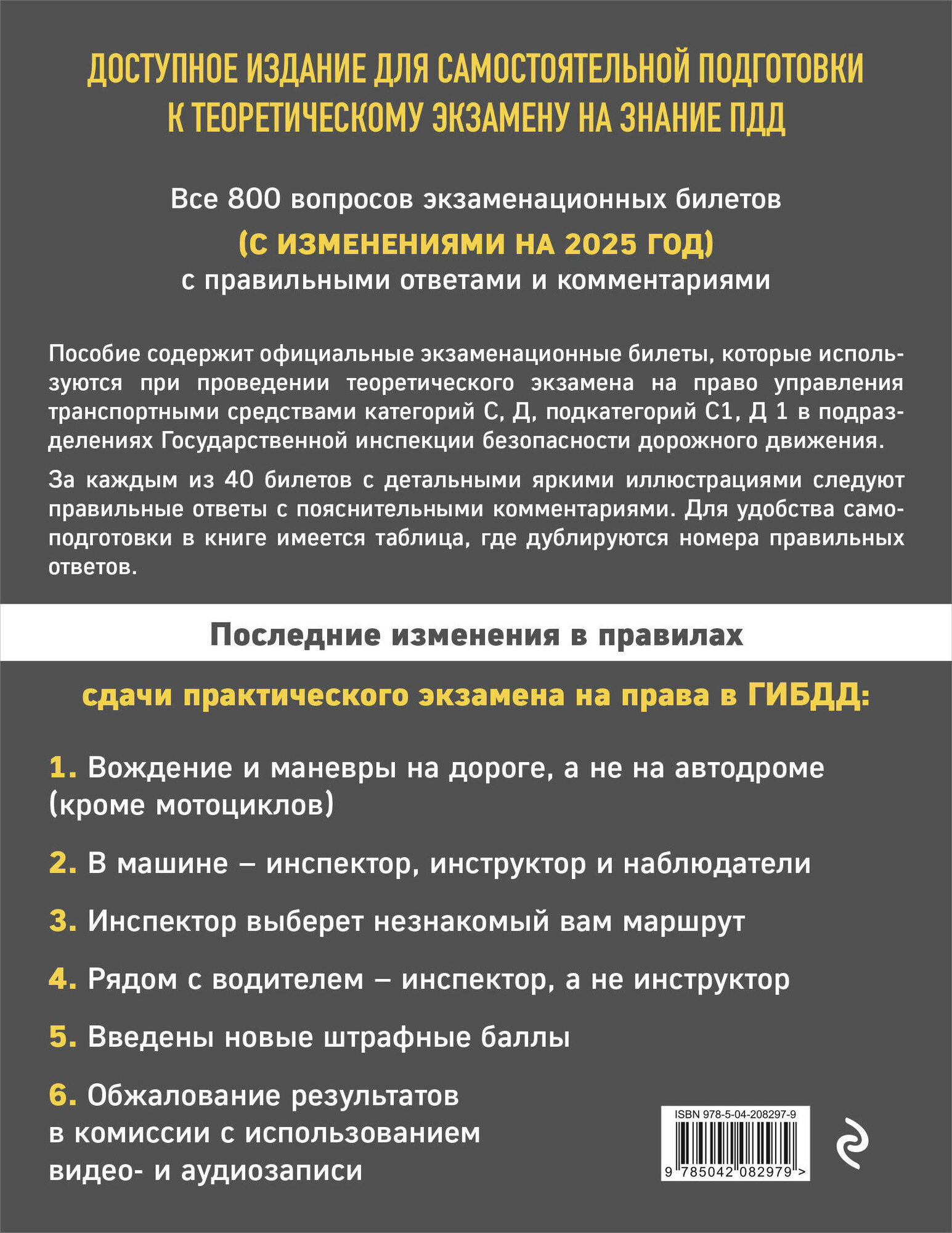 Издание содержит все 800 вопросов официальных экзаменационных билетов, которые используются при проведении теоретического экзамена на право управления транспортными средствами категорий С, Д, подкатегорий С1, Д 1 в подразделениях Государственной инспекции безопасности дорожного движения. За каждым из 40 билетов с детальными яркими иллюстрациями следуют правильные ответы с пояснительными комментариями. Для удобства самоподготовки в книге имеется таблица, где дублируются номера правильных ответов.