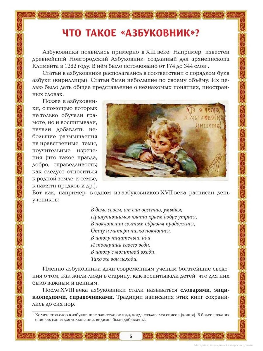 Главная тема статей "Азбуковника" - уникальные традиции, самобытные обряды, поверья русского народа, формировавшиеся в течение многих веков. Автор не ставит перед собой цель создания какого-то документально точного словаря, но следует идее Елизаветы Бём: в "Азбуковнике" кратко описаны те понятия, которые художница выбрала, чтобы передать значение каждой буквы кириллицы.