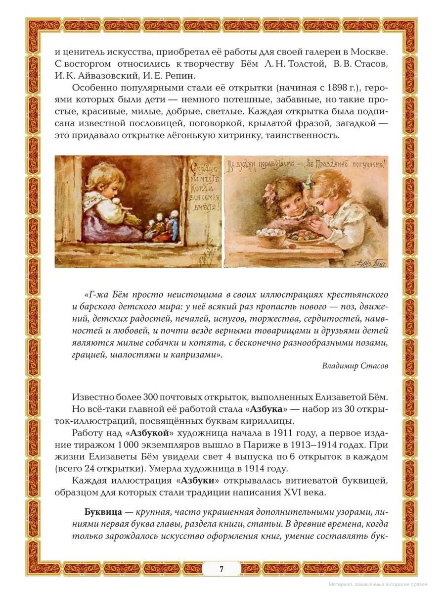 "Азбуковник" - книга, предназначенная для широкого круга читателей. Она написана по мотивам серии детских открыток "Азбука" уникальной русской художницы Елизаветы Меркурьевны Бём.