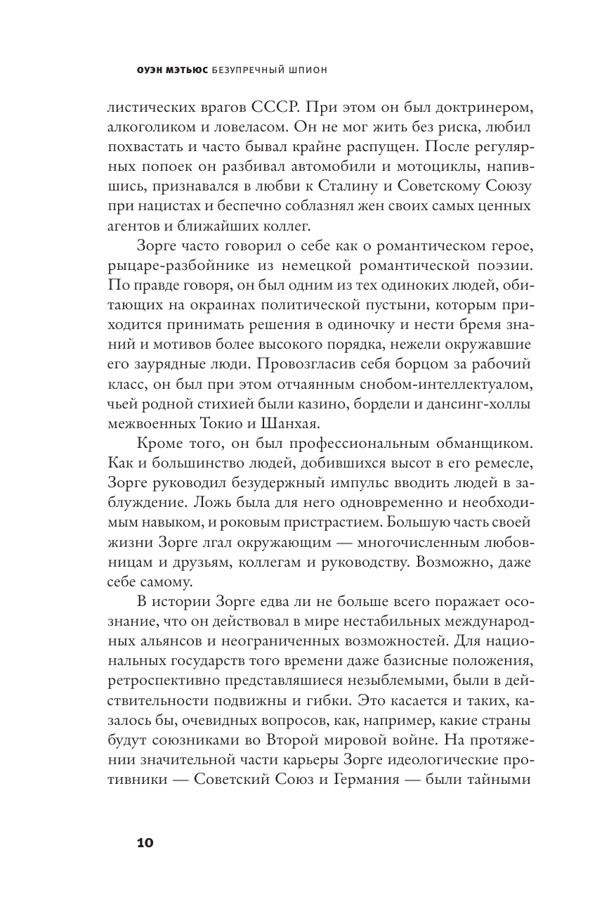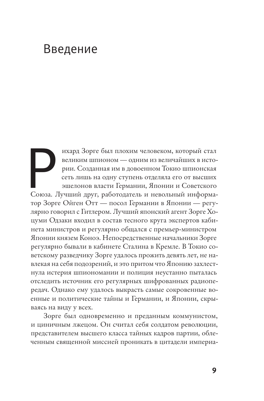 Мэтьюс не просто рассказывает о шпионской карьере Зорге, но и детально передает сложную политическую атмосферу того времени. Она была полна парадоксов: Зорге, будучи одним из самых ценных агентов, из-за недоверия московского Центра и бюрократических интриг не всегда получал заслуженное признание, а поставляемые им важнейшие разведданные могли с легкостью игнорироваться.