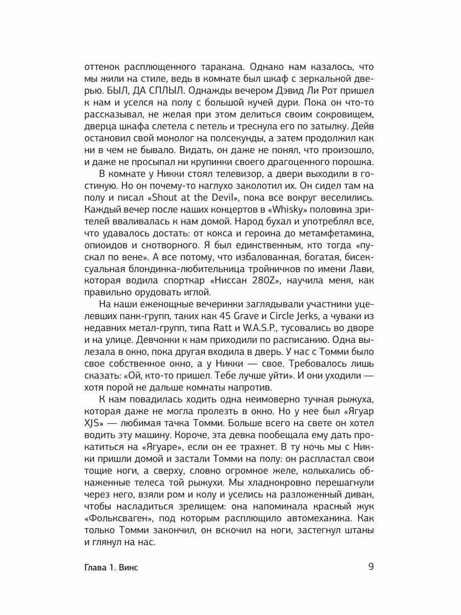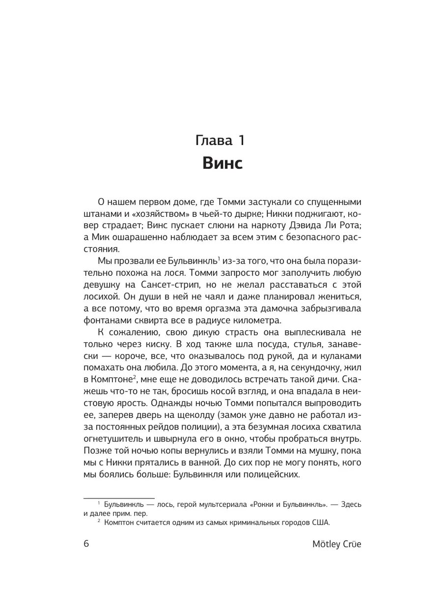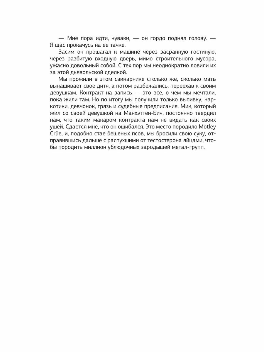 Возмутительная и бескомпромиссная автобиография Mötley Crüe — одной из самых безбашенных глэм-метал-групп в истории мировой музыки. Томми Ли, Никки Сикс, Винс Нил и Мик Марс раскроют для вас личные подробности о буднях рок-звезд. Погрузитесь с головой в мир безумных вечеринок, скандальных романов с суперзвездами, проблем с законом, провокационных образов, оккультизма и всего того, чем жили настоящие иконы глэм-метала.