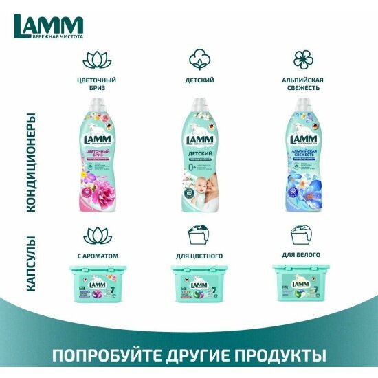 Капсулы для стирки LAMM "Альпийская свежесть" All in 1 с пониженным пенообразованием и биодобавками эффективно и бережно отстирывают белые и светлые изделия из хлопчатобумажных, льняных и синтетических тканей, а также тканей из смешанных волокон в стиральных машинах любого типа.