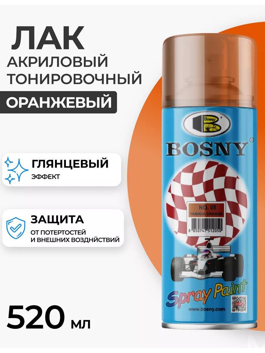 Bosny Акриловый аэрозольный тонировочный лак, цвет оранжевая ямаха, объем баллона 520 мл.