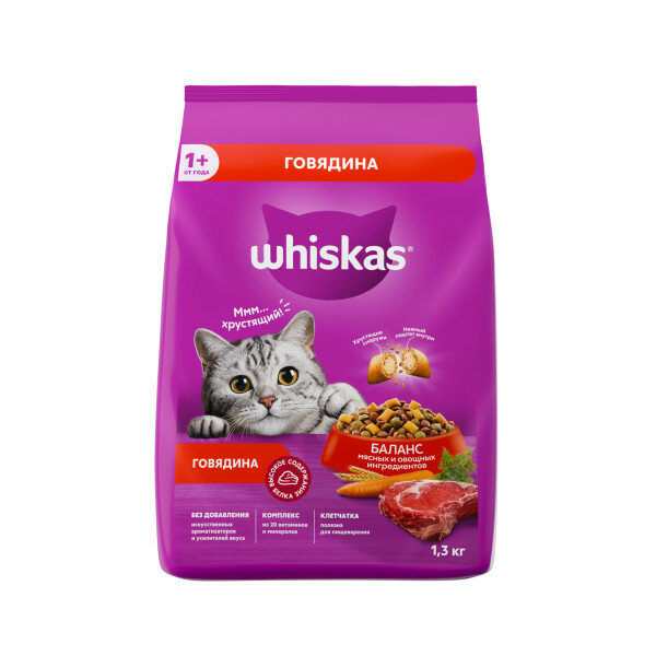 С особой заботой и вниманием мы создаем WHISKAS®! В каждой пачке - баланс мясных и овощных ингредиентов, чтобы ваш питомец получал все элементы, необходимые для здоровья. Ведь сбалансированное питание с высоким содержанием белка, сделанное из качественных ингредиентов - это именно то, что нужно кошке в любом возрасте. Попробовав аппетитные подушечки с хрустящей корочкой снаружи и нежным паштетом внутри, ваш питомец будет мурчать от удовольствия каждый день! Разнообразие - вот что обожают кошки! Порадуйте питомца сочетанием блюд из нашей коллекции: сухим кормом с хрустящими подушечками и влажным кормом - сочным желе, аппетитным рагу или нежным паштетом.