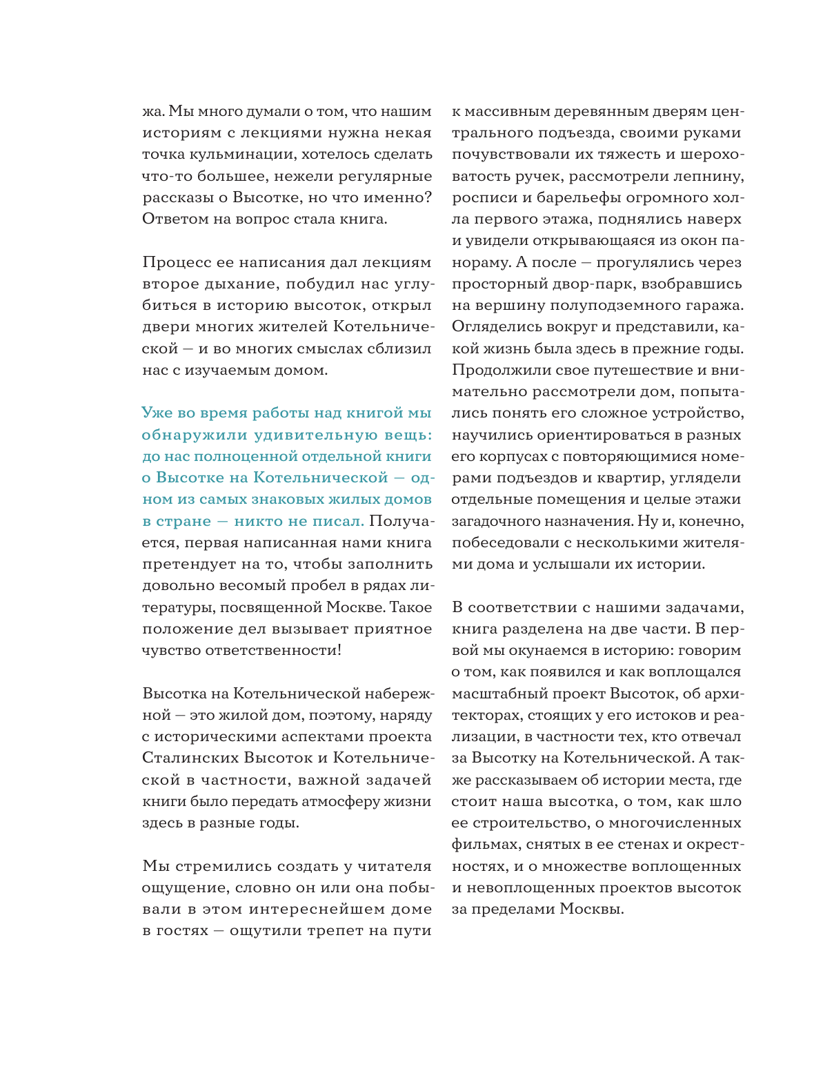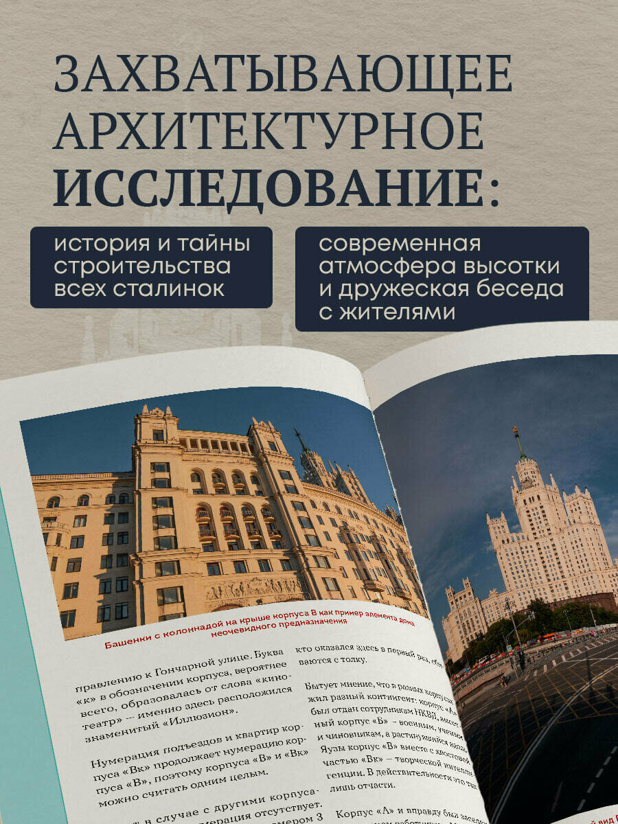 Первая часть книги погружает в историю и тайны строительства всех сталинок, включая Котельническую высотку. Авторы книги раскрывают каждый этап ее строительства, сопровождая повествование архивными документами и выдержками из писем, которые проливают свет на масштабы и значимость этого архитектурного проекта. Подробная графика наглядно покажет структуру одного из самых высоких зданий нашего города, благодаря чему вы сможете узнать, как выглядит Котельническая высотка изнутри.