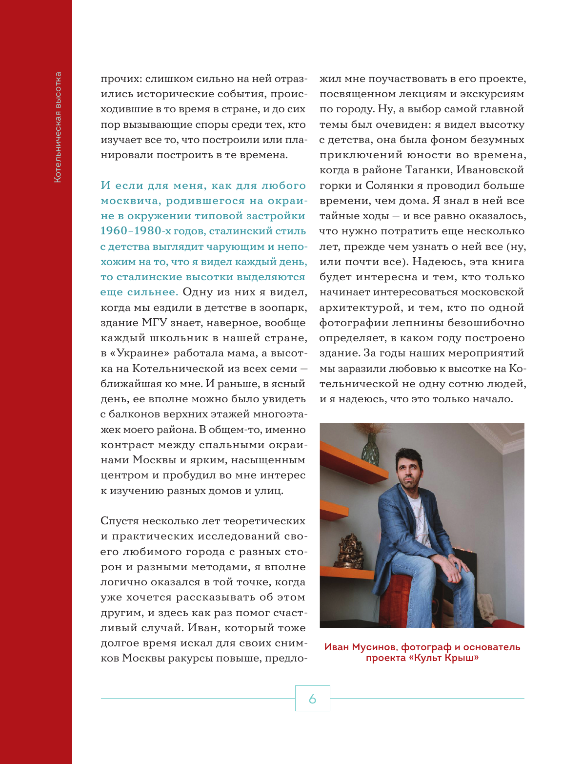 Во второй части книги вам посчастливится проникнуть в современную атмосферу высотки — чем и как живут дизайнеры, архитекторы, художники и другие деятели культуры, которые называют Котельническую высотку домом? Как начиналась их жизнь в этих стенах и какие ранее не рассказанные истории наполняют эти квартиры? Об этом вы подробно узнаете из интервью, которые проиллюстрированы архивными фотографиями жителей и современными снимками одного из авторов книги.