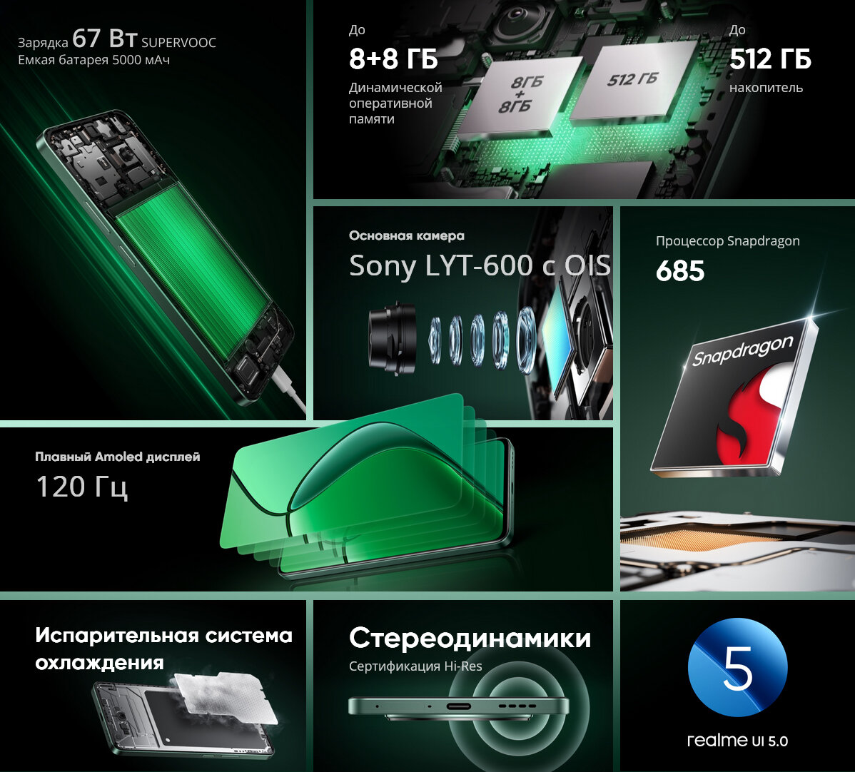 Встречайте мощный смартфон Realme 12. Создан работать долго. Создан быть быстрым. Оснащен невероятно плавным AMOLED дисплеем 120 Гц. Благодаря искусственному интеллекту Realme 12 поднимает плавность работы на новый уровень. Преодолейте задержки и играйте в мощные игры даже при высокой частоте кадров. Благодаря сочетанию технологий Smooth Boost и Game Boost вы сможете работать в многозадачном режиме и играть в более стабильные и отзывчивые игры.