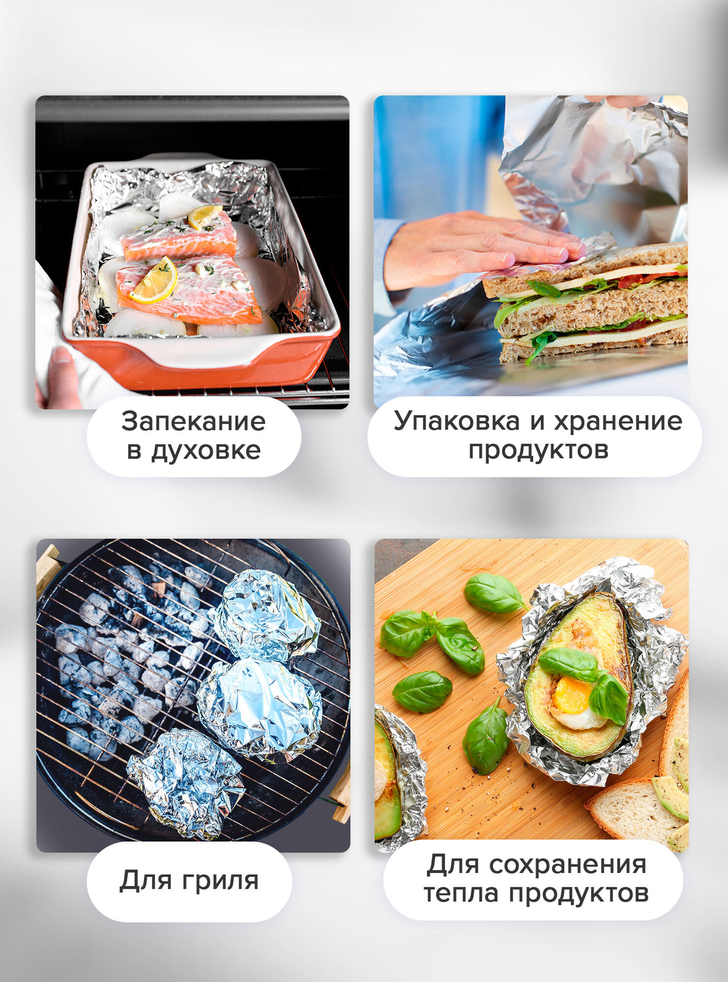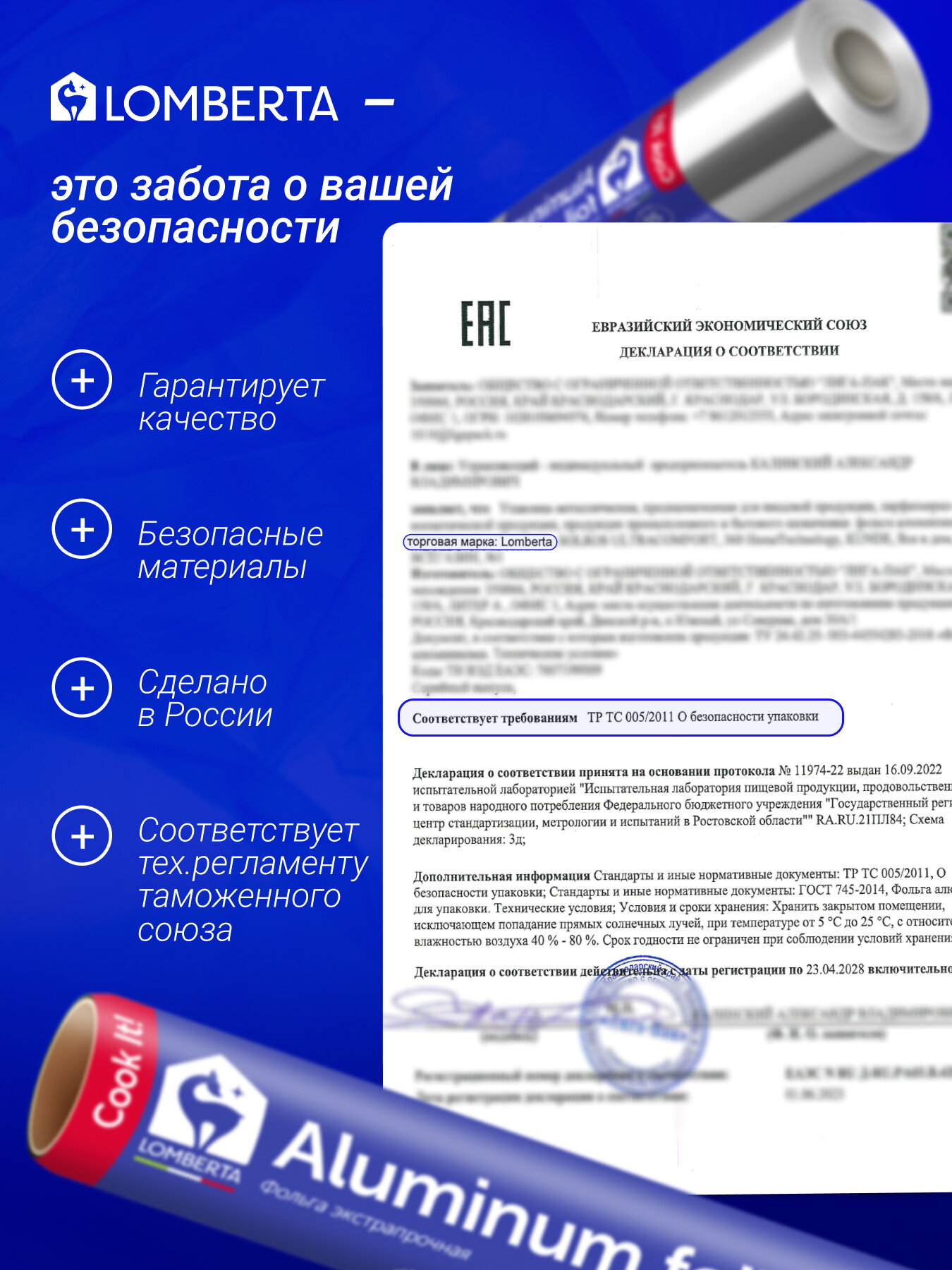 Высококачественная алюминиевая фольга от Lomberta прекрасно подходит для готовки мяса и рыбы на мангале, гриле, углях и открытом огне. Пищевая фольга с увеличенной плотностью 20 микрон более прочная и плотная по сравнению с обычной хозяйственной фольгой. Она отлично сохраняет свежесть продуктов и лучше удерживает тепло. Фольга подходит для запекания и хранения готовой еды в холодильнике. Фольга сохраняет температуру продуктов, не меняет их запах и вкус, а также устойчива к разрывам. Алюминиевая фольга также подходит для холодных кондитерских изделий и выпечки.