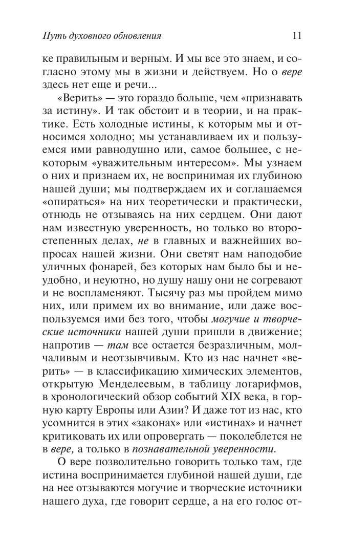 «Путь духовного обновления» — один из основополагающих трудов Ильина, над которым он работал в 1930-е годы. Что же такое, согласно убеждению мыслителя, традиционные духовные ценности русского общества? Патриотизм и высокая нравственность, любовь к национальной культуре, духовное здоровье и религиозность народа. И путь духовного обновления, очищения от дьявольских соблазнов «красной чумы» социализма лежит через новое обретение русскими понимания, что значат вера и любовь, свобода и совесть, семья и родина, национальное и правовое самосознание, государство и многое другое. Также в сборник вошла работа «Религиозный смысл философии».