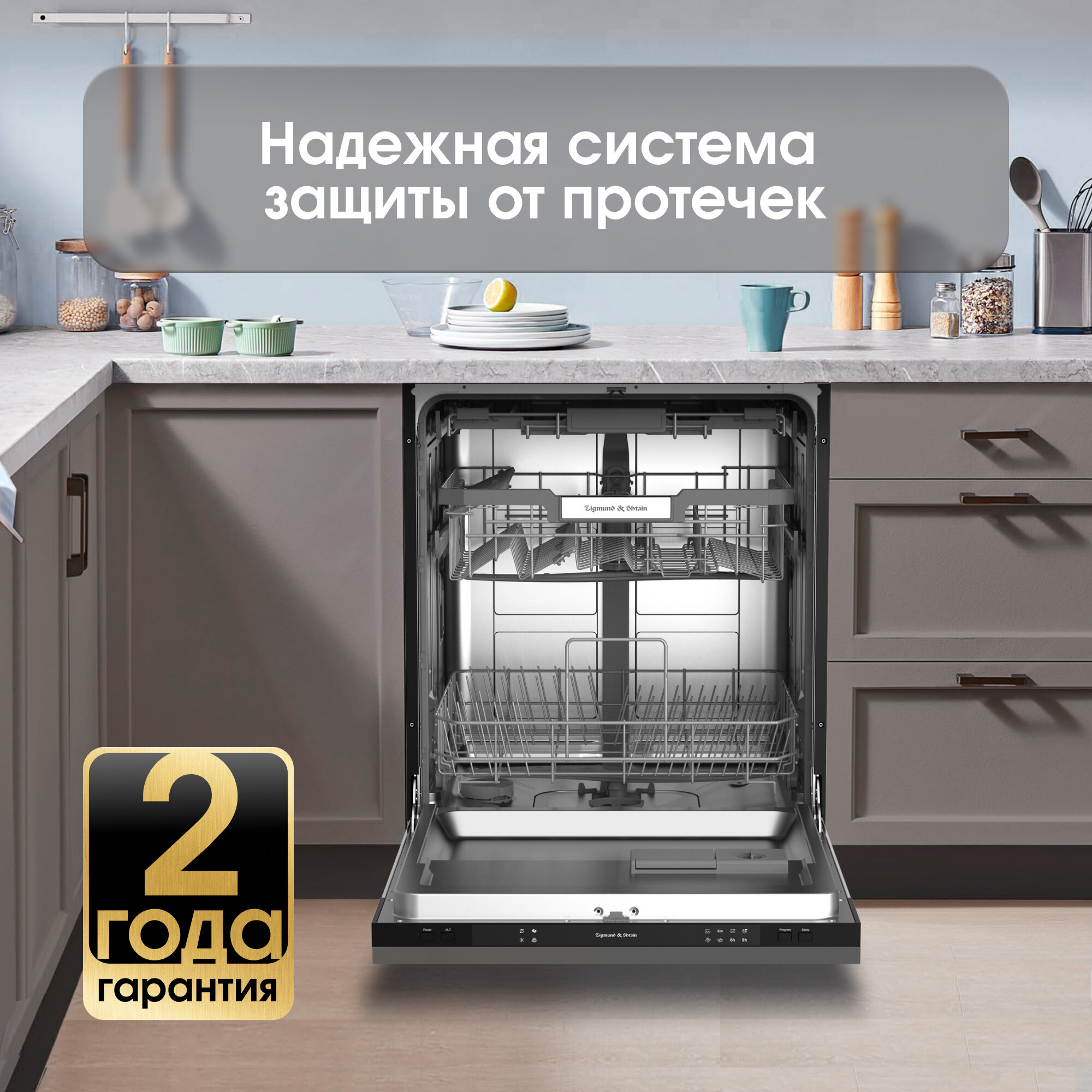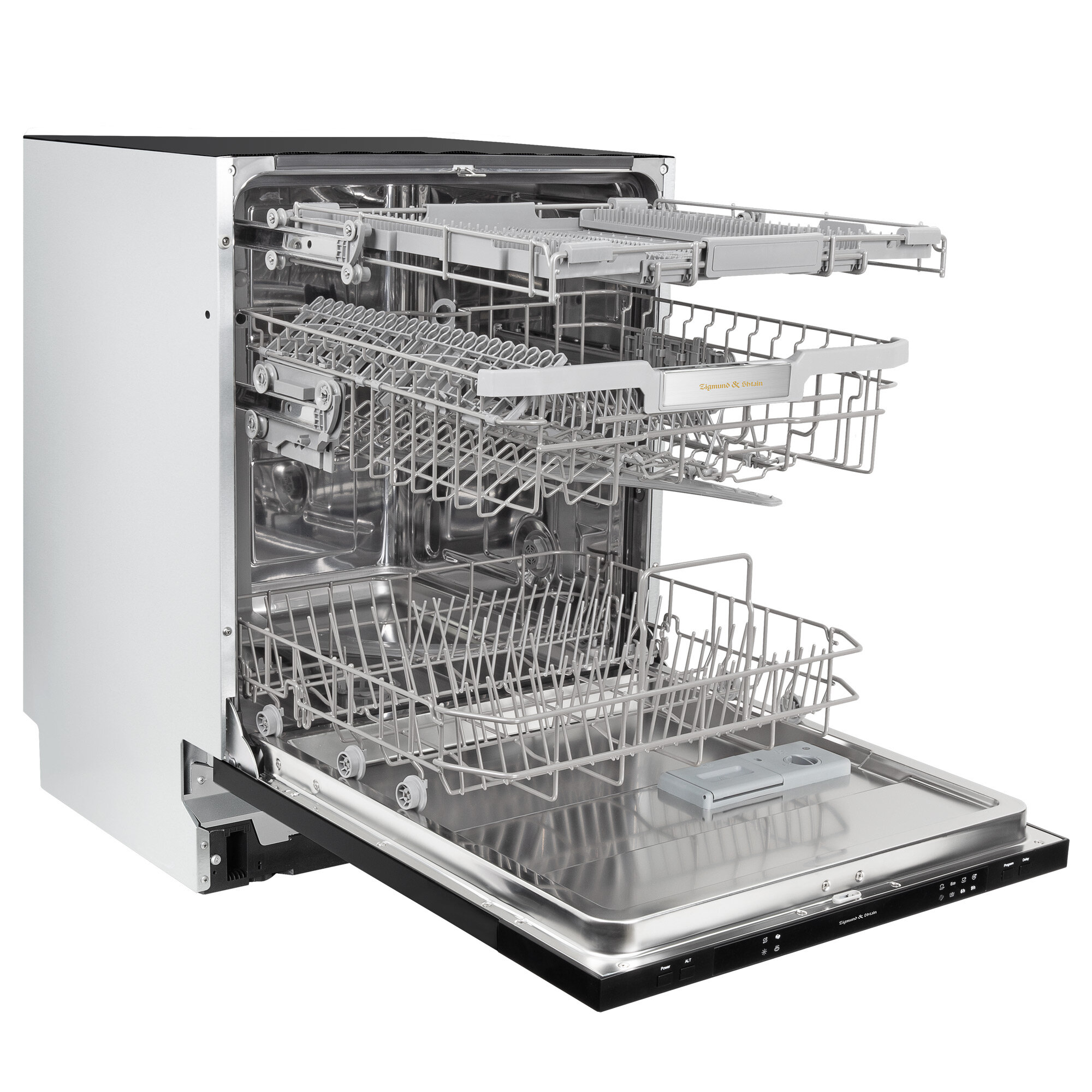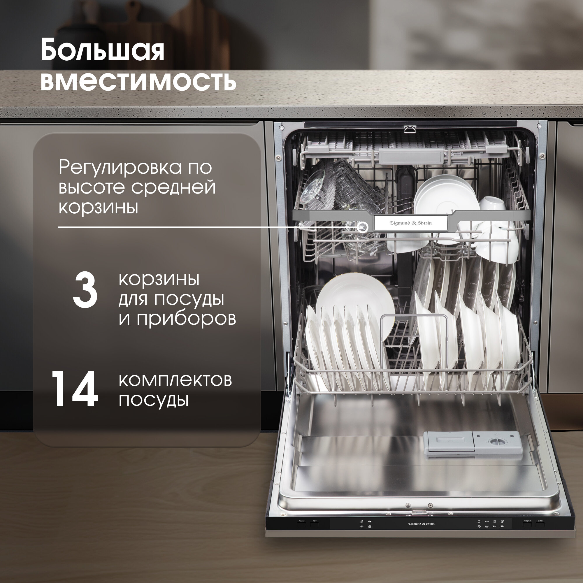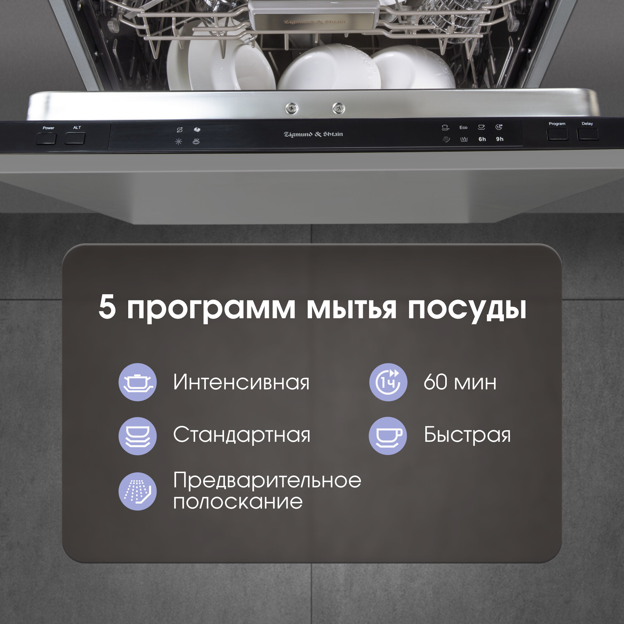 Посудомоечная машина Zigmund & Shtain сочетает в себе компактность, многофункциональность, экономию и качество. ПММ легко отмоет 14 комплектов посуды, тщательно ополаскивает поверхность столовых приборов, не оставляя следов моющих средств. Несмотря на многофункциональность, имеет простую панель управления с интуитивно понятным интерфейсов. Встраиваемая техника гармонично вписывается в современный интерьер кухни и экономит не только воду и ваше время, но и место даже на небольшой по площади кухни.Достоинства посудомойки:5 встроенных программ под любые потребности пользователя исходя из времени, типа посуды и экономии электроэнергии:интенсивная (60°С, 169 мин)60 минут (60°С, 60 мин)стандартная (46°С, 178 мин)быстрая (45°С, 147 мин)полоскание (11 минут)Функция отложенного старта до 9 часов и тихая работа дает возможность использовать посудомойку в ночное время. Вы также можете запланировать окончание процесса мытья к вашему приходу домой.Индикатор нехватки соли или ополаскивателя вовремя предупредит о необходимости пополнения.Высота корзин регулируется, чтобы вы могли разместить на нижней корзине объемную посуду, например, кастрюли.Отдельная корзина для столовых приборов дает возможность легче, быстрее и оптимальное разложить предметы для качественной обработки и удобной загрузке.Оптимальное расположение корзин гарантирует эффективный и качественный результат.Расход воды на цикл составляет 9 литров, что окупит стоимость техники уже через год пользования.3 независимых разбрызгивателя эффективнее всего производят очищение посуды с минимальными тратами воды и электроэнергии.Вам не обязательно дожидаться, пока посудомоечная машина загрузится целиком. Функция половинной загрузки позволяет указать, на какой корзине располагается посуда и экономно обработать нужный участок.Вы сможете доложить посуду даже после запуска программы мытья, не нарушая запрограммированную работу.