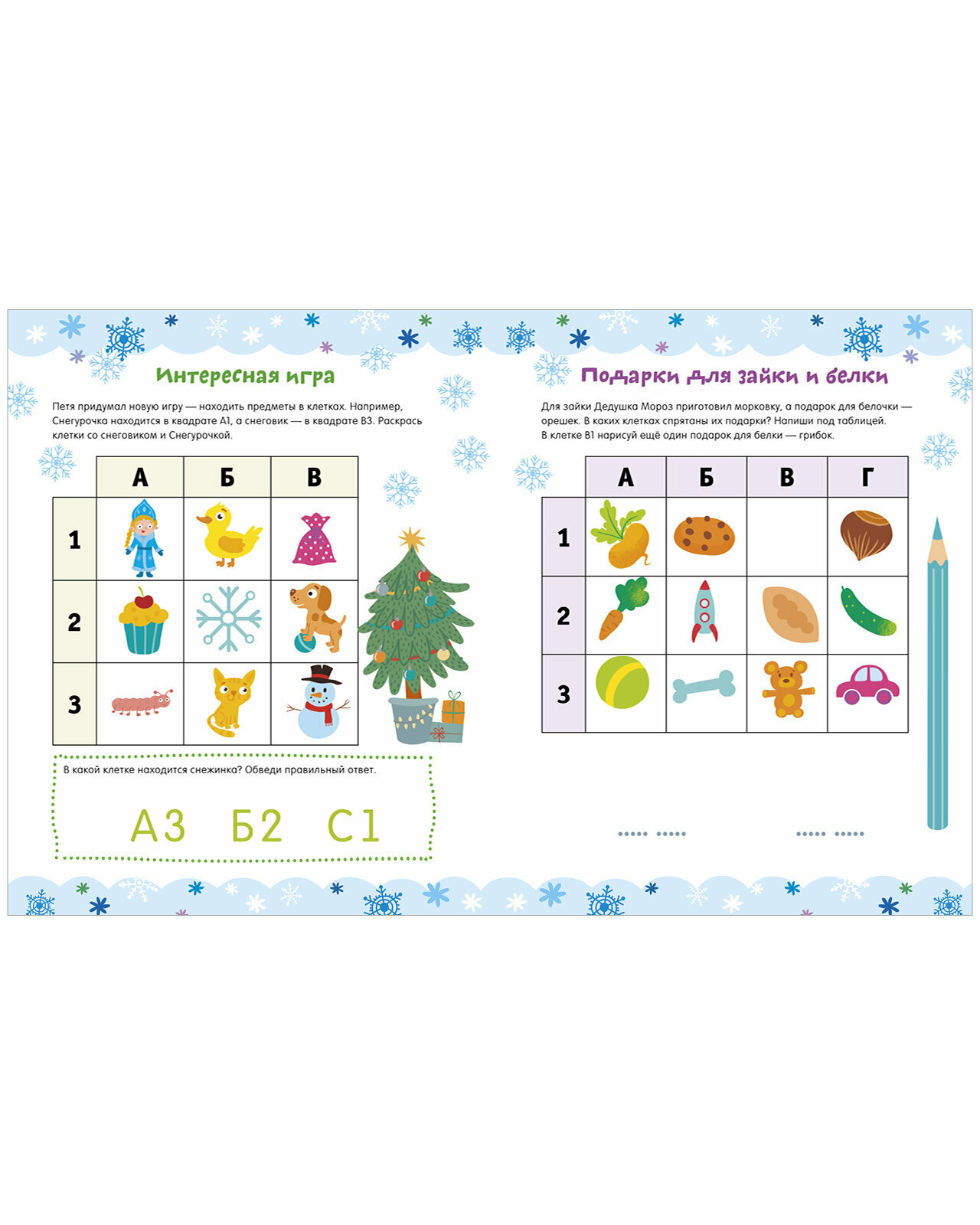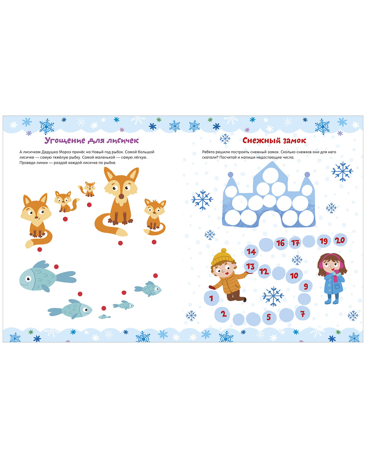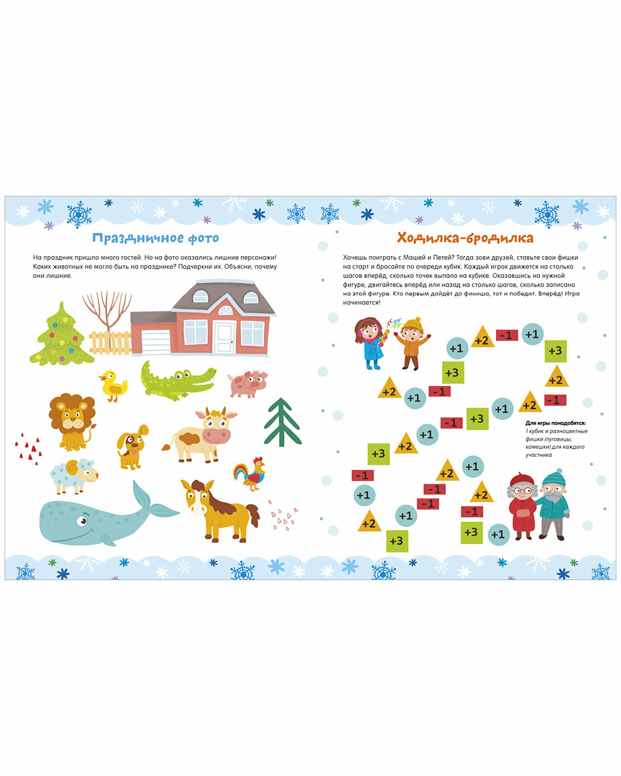 Каждая страница — это маленькая история, где ребенку отведена роль помощника главных героев. Помогая Маше, Пете, Деду Морозу, Снегурочке и другим персонажам, малыш посчитает имбирные пряники, составит собственный зимний букет, поможет найти угощения для лисичек и выполнит еще много интересных и полезных упражнений для тренировки навыков счета, логики, подготовки руки к письму и других полезных навыков