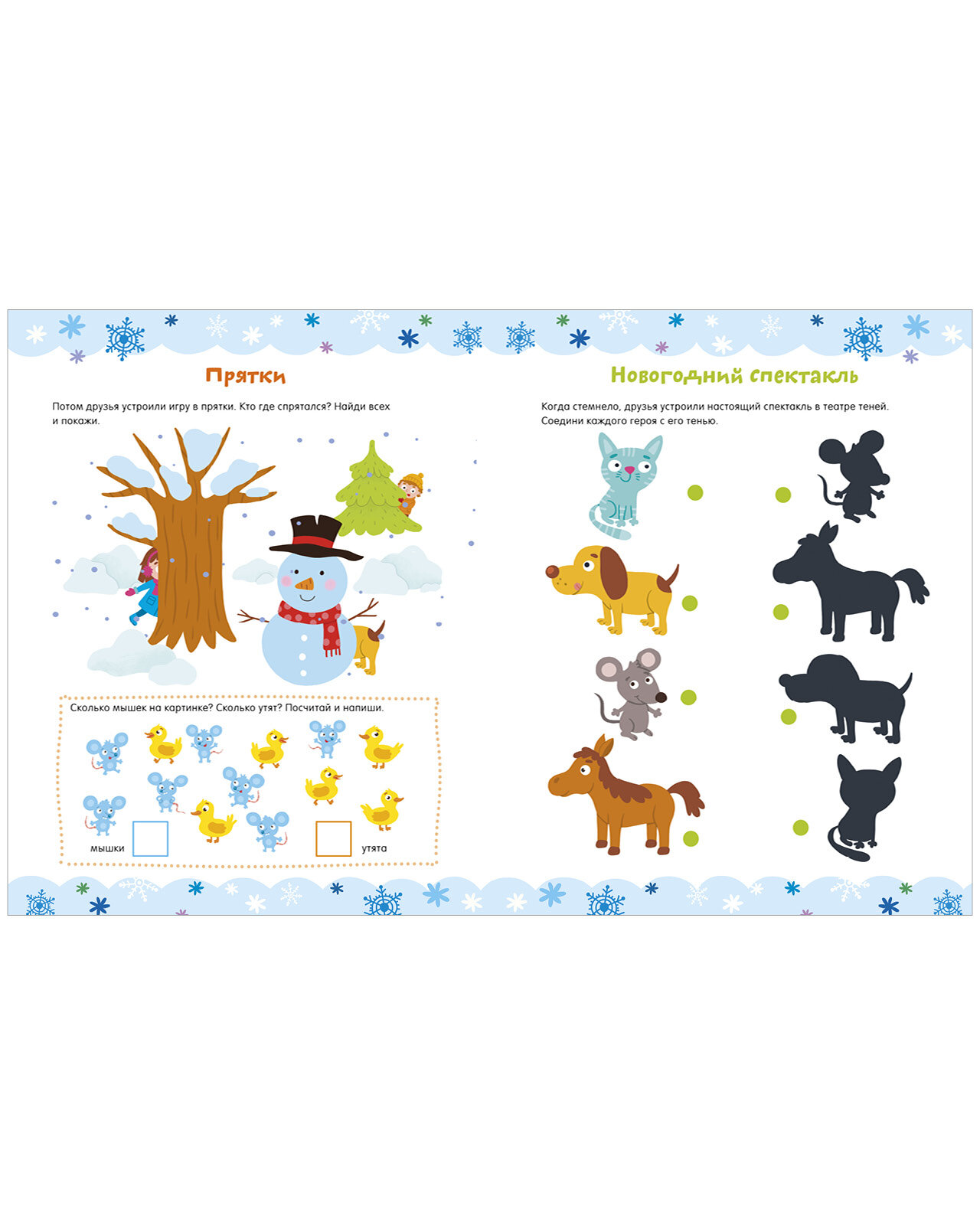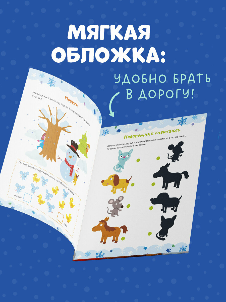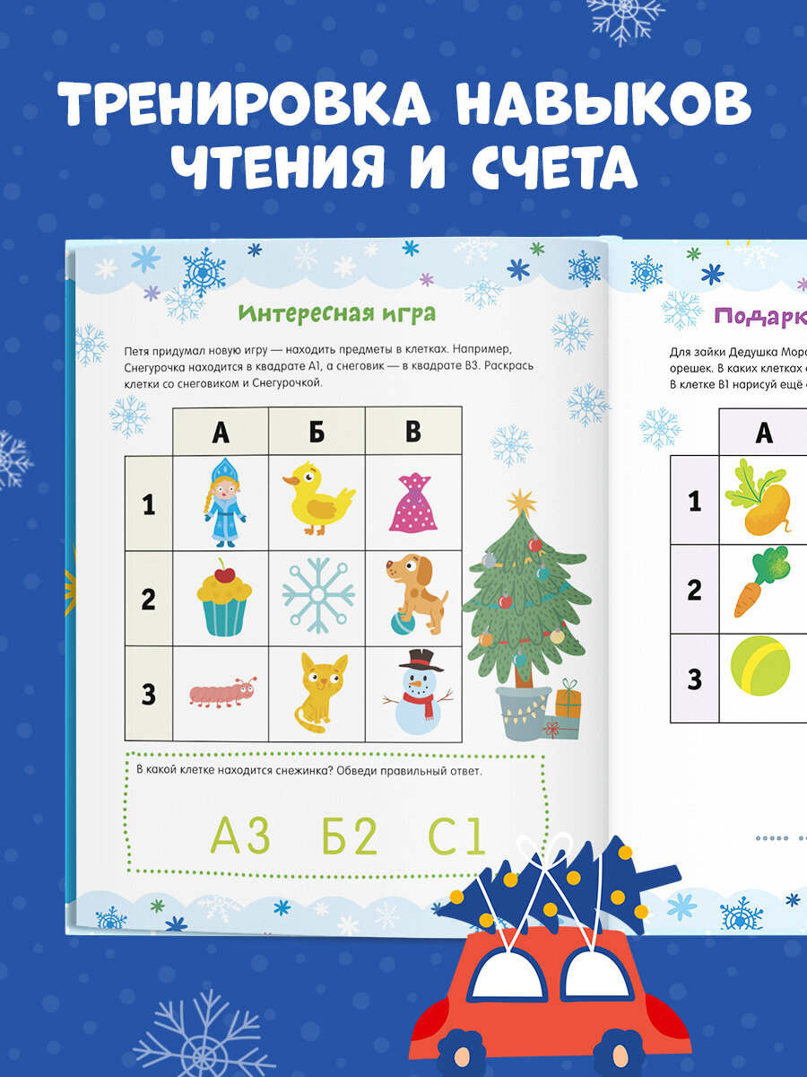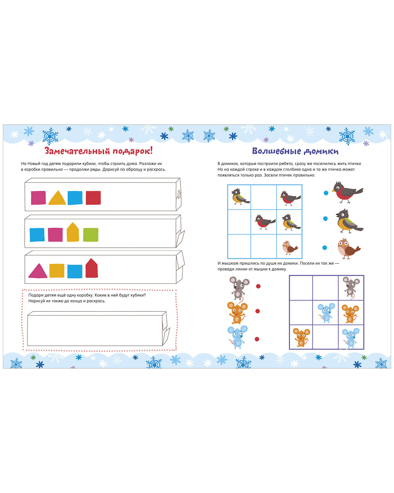 Каждая страница — это маленькая история, где ребенку отведена роль помощника главных героев. Помогая Маше, Пете, Деду Морозу, Снегурочке и другим персонажам, малыш посчитает имбирные пряники, составит собственный зимний букет, поможет найти угощения для лисичек и выполнит еще много интересных и полезных упражнений для тренировки навыков счета, логики, подготовки руки к письму и других полезных навыков