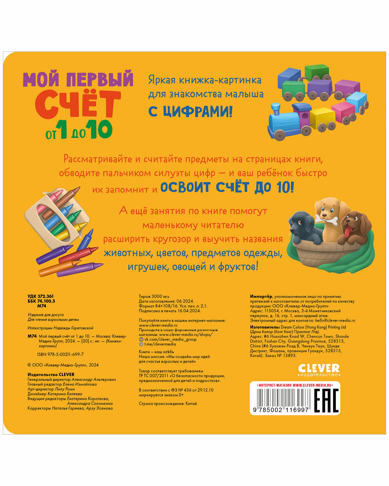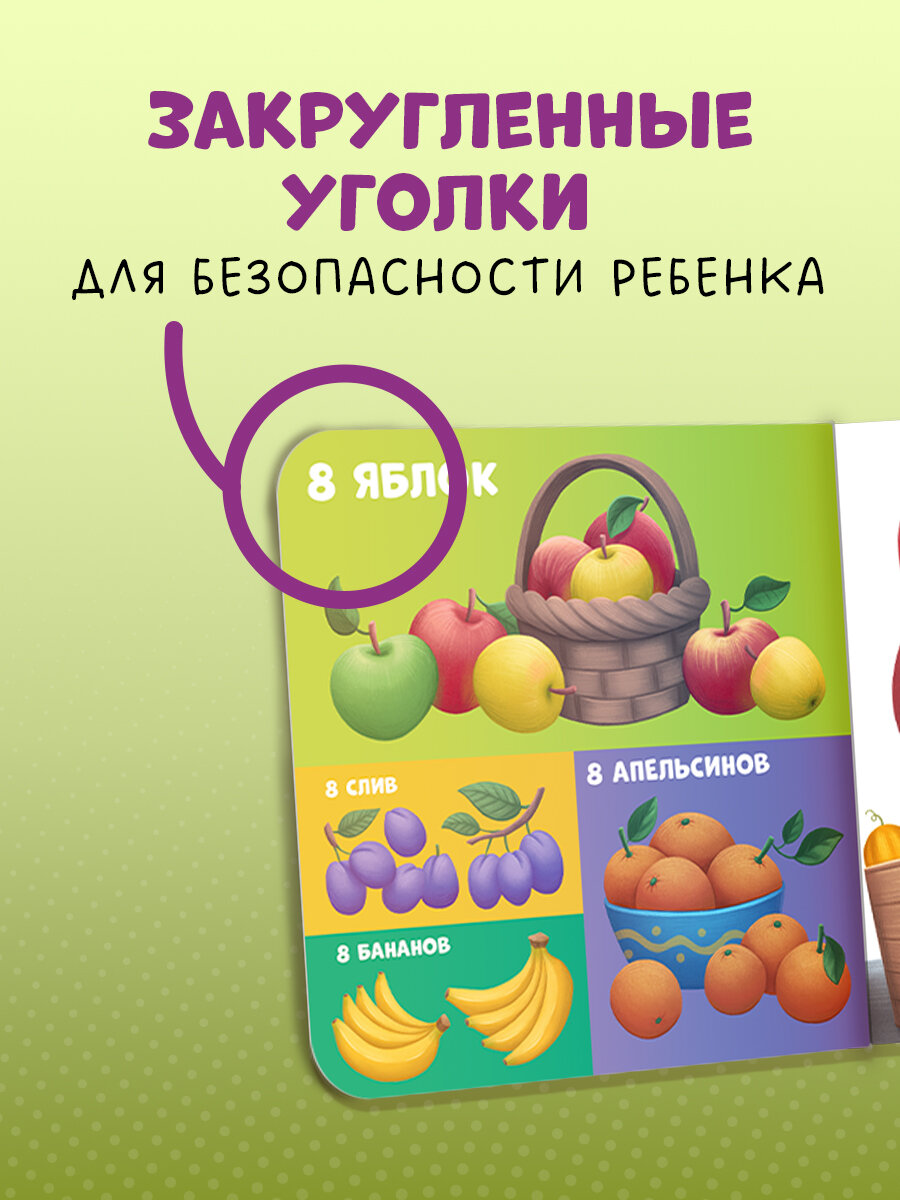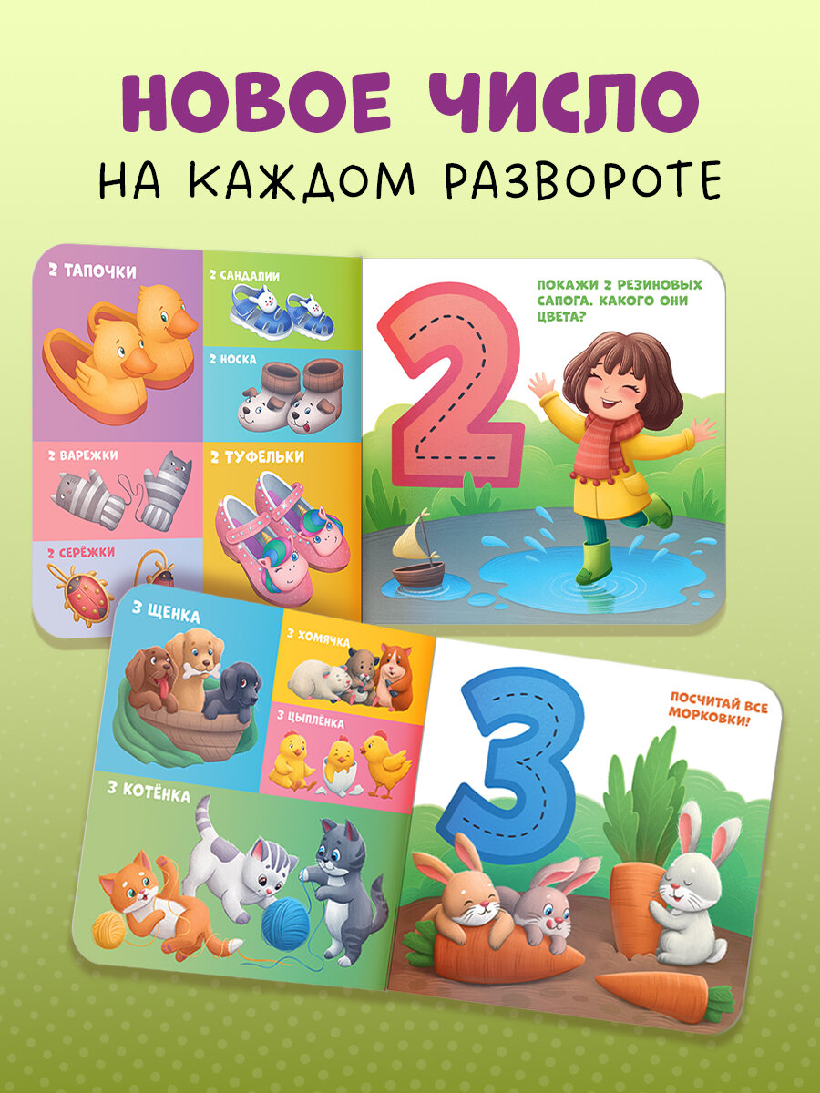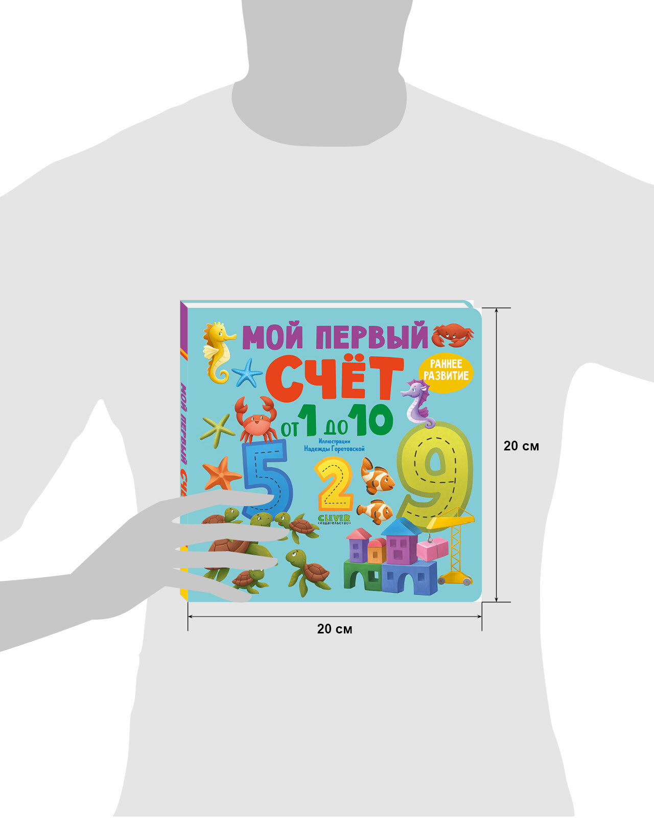 Clever Книжки-картонки Мой первый счет от 1 до 10 Яркая книжка-картинка для знакомства малыша с цифрами! Рассматривайте и считайте предметы на страницах книги, обводите пальчиком силуэты цифр – и ваш ребёнок быстро их запомнит и освоит счёт до 10! А ещё занятия по книге помогут маленькому читателю расширить кругозор и выучить названия животных, цветов, предметов одежды, игрушек, овощей и фруктов!