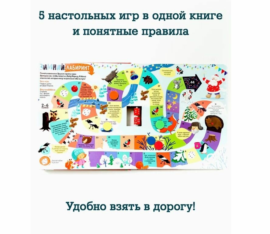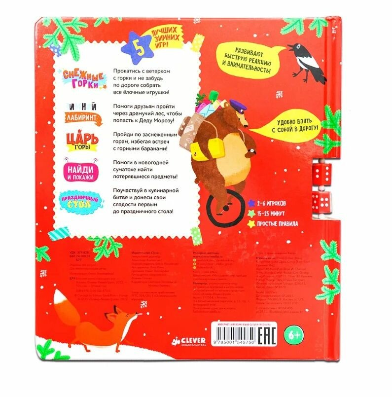 Clever Время играть. Большая книга новогодних игр 5 лучших зимних игр! Снежные горки. Прокатись с ветерком с горки и не забудь по дороге собрать все ёлочные игрушки! Зимний лабиринт. Помоги друзьям пройти через дремучий лес, чтобы попасть к Деду Морозу! Царь горы. Пройди по заснеженным горам, избегая встреч с горными баранами! Найди и покажи. Помоги найти в новогодней суматохе потерявшиеся предметы! Праздничный стол. Поучаствуй в кулинарной битве и донеси свои сладости первым до праздничного стола!