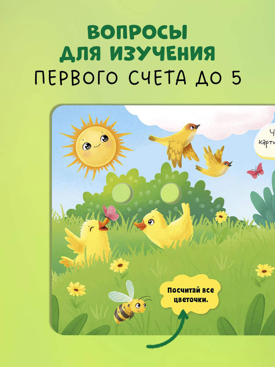 Изучайте первые цвета, счёт до 5 и животных вместе с яркими зверятами на каждой странице.