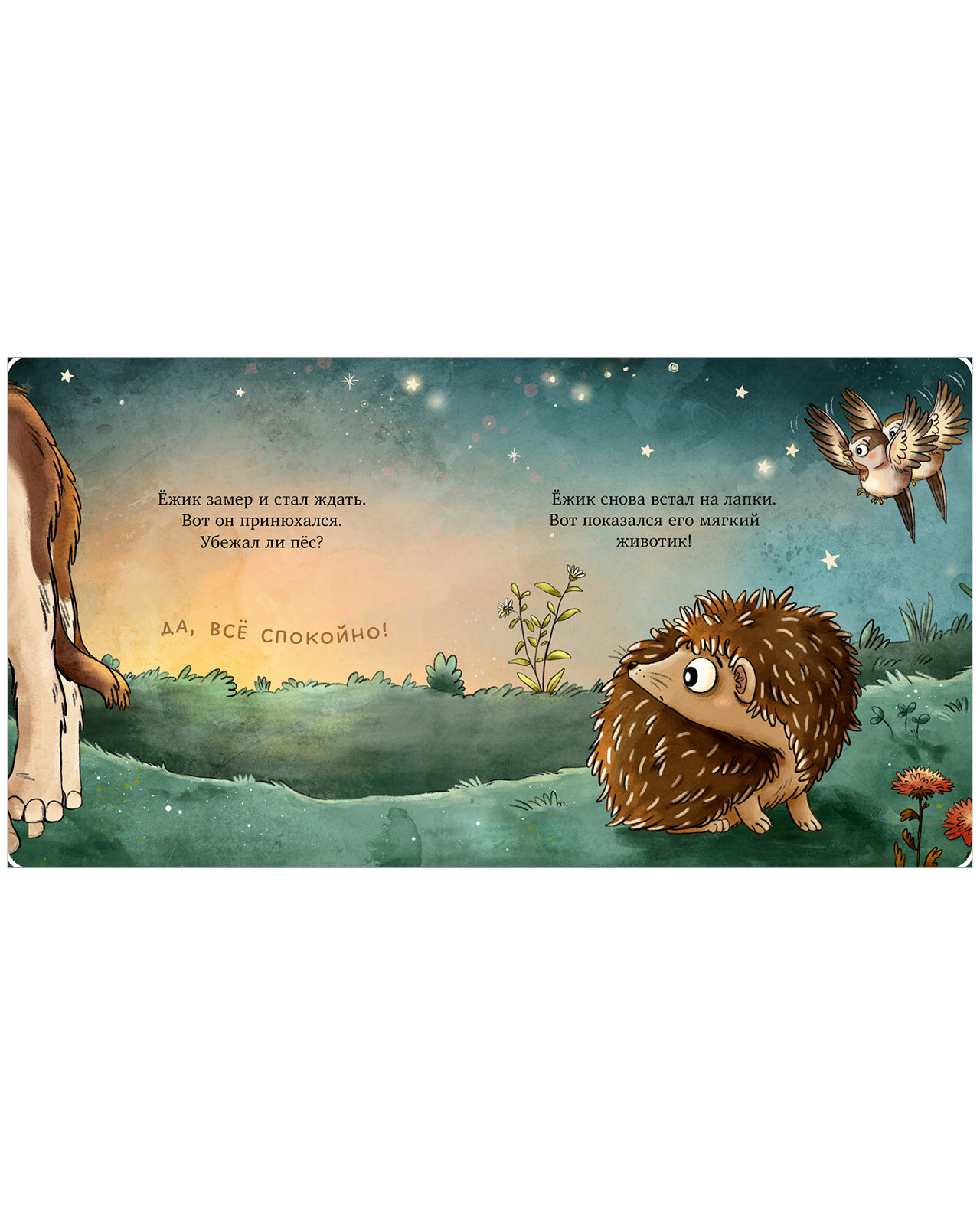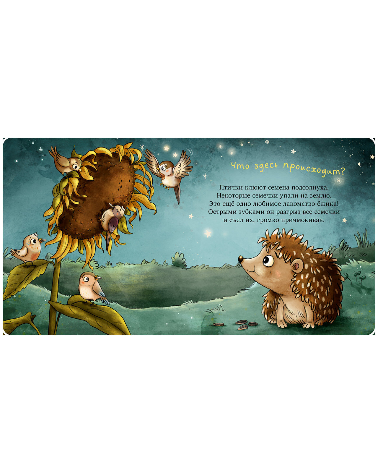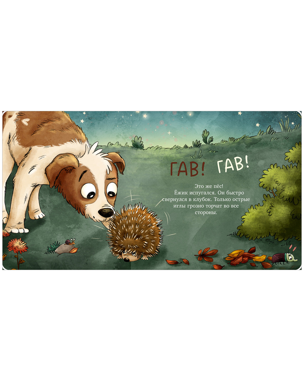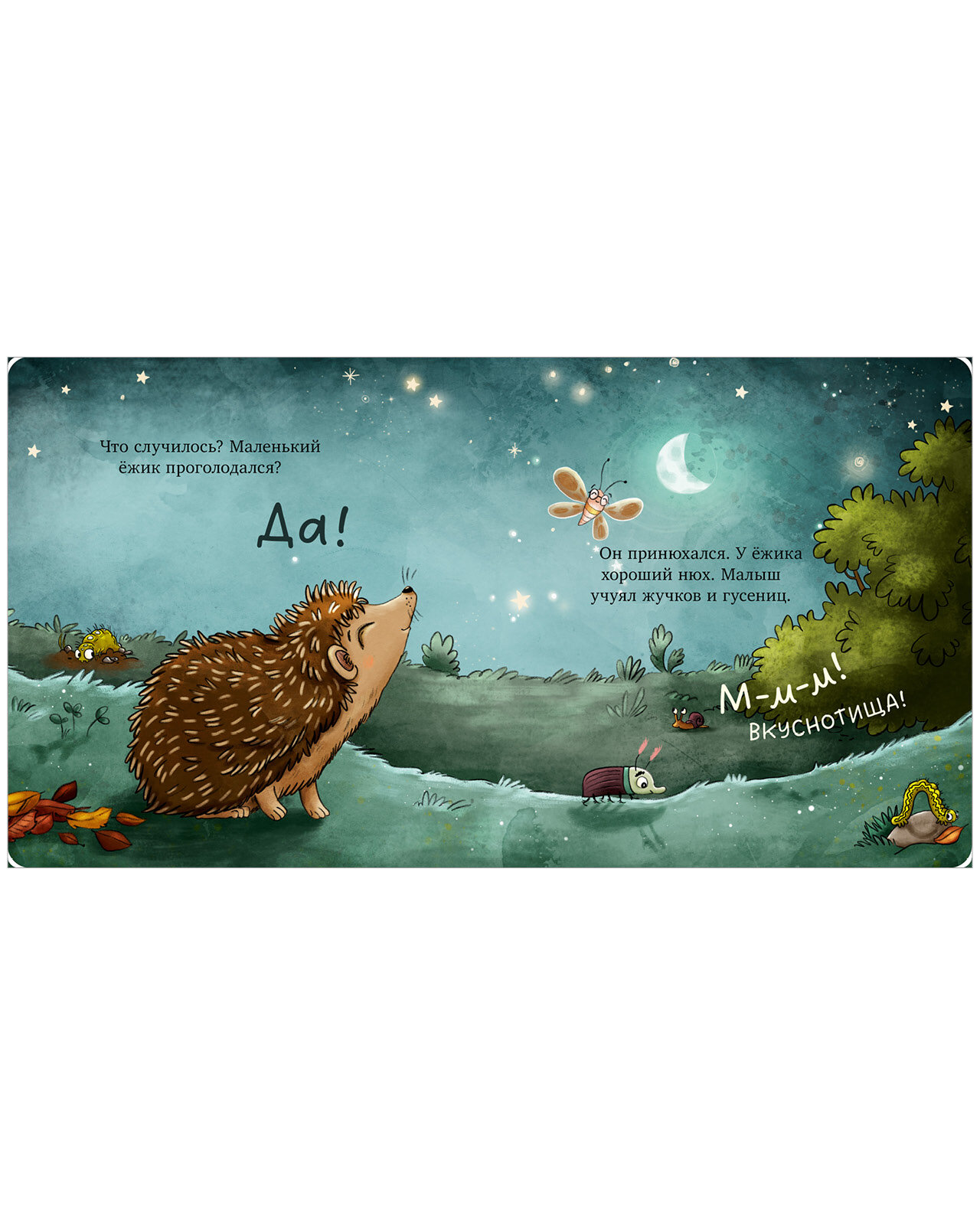 Малыш-ежик вышел прогуляться вечером, поел гусениц и жучков, спрятался от собаки, свернувшись в колючий клубок, и отправился спать, когда над садом взошло солнце. В конце книги перечислены все интересные факты о том, как живут ежи в природе.