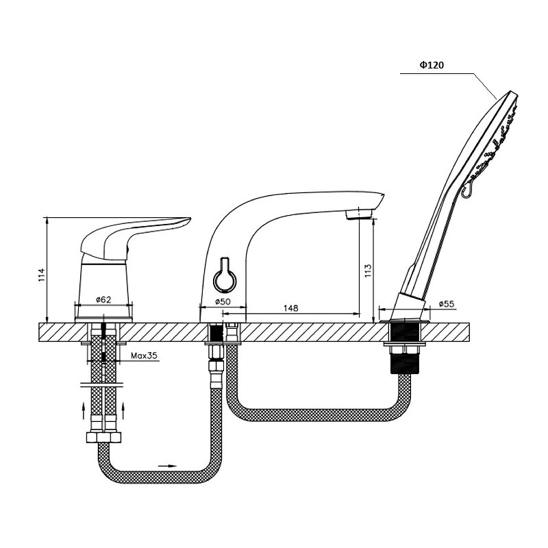 Однозахватный смеситель для ванны с фиксированным изливом и душевым набором Orange предназначен для установки на борт ванны. Корпус выполнен из высококачественной латуни, не подверженной коррозии от длительного контакта с водой. Глянцевая хромированная поверхность служит защитой от коррозии и внешних механических воздействий. Фирменный керамический картридж Orange и эргономичный рычаг обеспечивают плавный уверенный ход без проскальзываний. Переключение между режимами душ/ванна осуществляется с помощью поворотного дивертора. В комплекте душевой набор: душевая лейка d120 мм (5 режимов), шланг в металлической оплетке 1500 мм (с защитой от перекручивания).