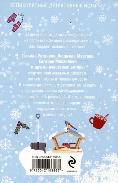 Замечательные детективные истории из сборника «Зимние расследования» вам подарят любимые писатели. Татьяна Устинова, Людмила Мартова, Евгения Михайлова и другие известные авторы очаруют оригинальным сюжетом, легким стилем и тонким юмором. В каждом детективном рассказе вы найдете увлекательное расследование с неожиданной развязкой. А потрясающая зимняя атмосфера подарит ощущение тепла и уюта в холодные дни!